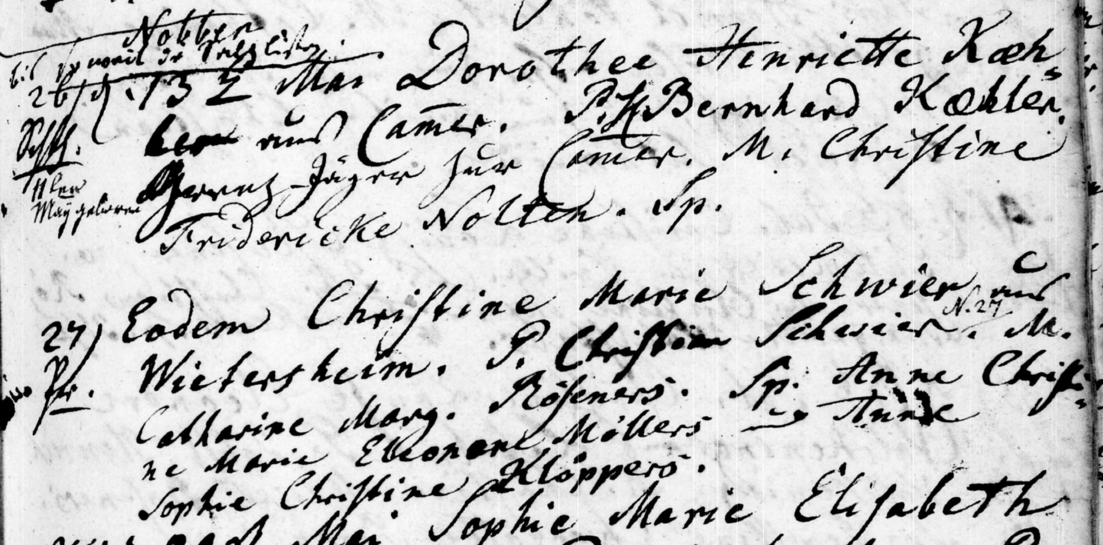 27) [By the Pastor.] [Baptized] On the same day, Christine Marie Schwier from Wietersheim. Father Christian Schwier N. 27. Mother Catherine Marg. Röseners. Sponsors Anne Christine Marie Eleonore Möllers, Anne Sophie Christine Klöppers. |