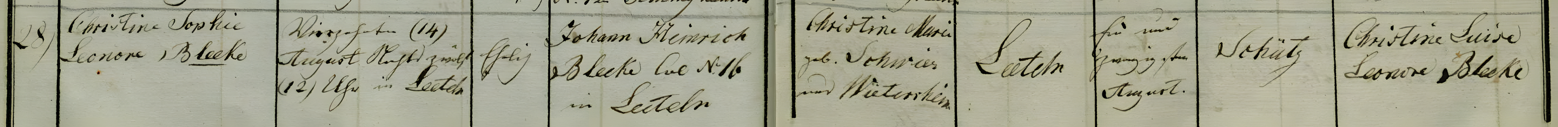 Evangelische Gemeinde Frille (Kreis Minden), Kirchenbuchduplikate, section headed "Gebohrne und Getaufte im Kirchspiel königlich Preußlich Anteils im Jahre 1831" [sic.], Nr. 28, Christine Sophie Leonore Bleeke, born 14 Aug. 1831, baptized 21 Aug. 1831, son of Johann Heinrich Bleeke and Christine Marie Schwier; Landesarchiv Nordrhein-Westfalen, Abteilung Ostwestfalen-Lippe (Detmold), Personenstandsarchiv Westfalen-Lippe; P 1 B-D, B 168 (Jg. 1831–1845); digital images, Archivsuche – Archive in NRW (DFG-Viewer), Image 17 of 210 (accessed 18 September 2025); duplicate register; provenance: Land- und Stadt- bzw. Kreisgericht Minden.
