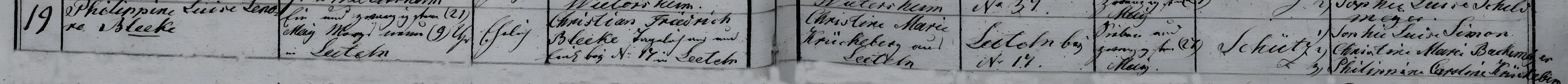 Evangelische Gemeinde Frille (Kreis Minden), Kirchenbuchduplikate, section headed "Geborne und Getaufte im Jahr 1833 Kirchspiel Frille köngilich Preußischen Anteil" [sic.], Nr. 19, Philippine Luise Leonore Bleeke, born 21 May 1833, baptized 27 May 1833; Landesarchiv Nordrhein-Westfalen, Abteilung Ostwestfalen-Lippe (Detmold), Personenstandsarchiv Westfalen-Lippe; P 1 B-D, B 168 (Jg. 1831-1845); digital images, Archivsuche – Archive in NRW (DFG-Viewer), Image 100 of 180 (accessed 20 September 2025); duplicate register; provenance: Land- und Stadt- bzw. Kreisgericht Minden.