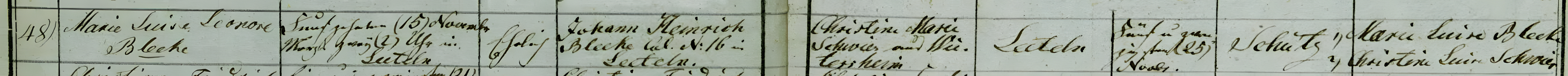 Evangelische Gemeinde Frille (Kreis Minden), Kirchenbuchduplikate, section headed "Gebohrne und Getaufte im Jahre 1833 Kirchspiel Frille königlich Preußlich Anteils" [sic.], Nr. 28, Marie Luise Leonore Bleeke, born 15 Nov. 1833, baptized 25 Nov. 1833, son of Johann Heinrich Bleeke and Christine Marie Schwier; Landesarchiv Nordrhein-Westfalen, Abteilung Ostwestfalen-Lippe (Detmold), Personenstandsarchiv Westfalen-Lippe; P 1 B-D, B 168 (Jg. 1831–1845); digital images, Archivsuche – Archive in NRW (DFG-Viewer), Image 38 of 210 (accessed 18 September 2025); duplicate register; provenance: Land- und Stadt- bzw. Kreisgericht Minden.