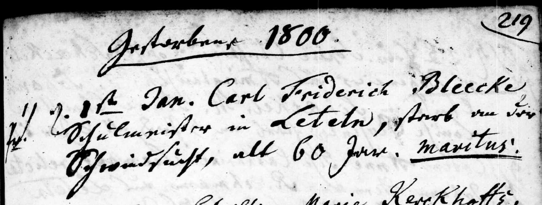 1) On January 1st 1800 Carl Fridrich Bleecke Pr. schoolmaster in Letelen, died from consumption, at age 60 married |