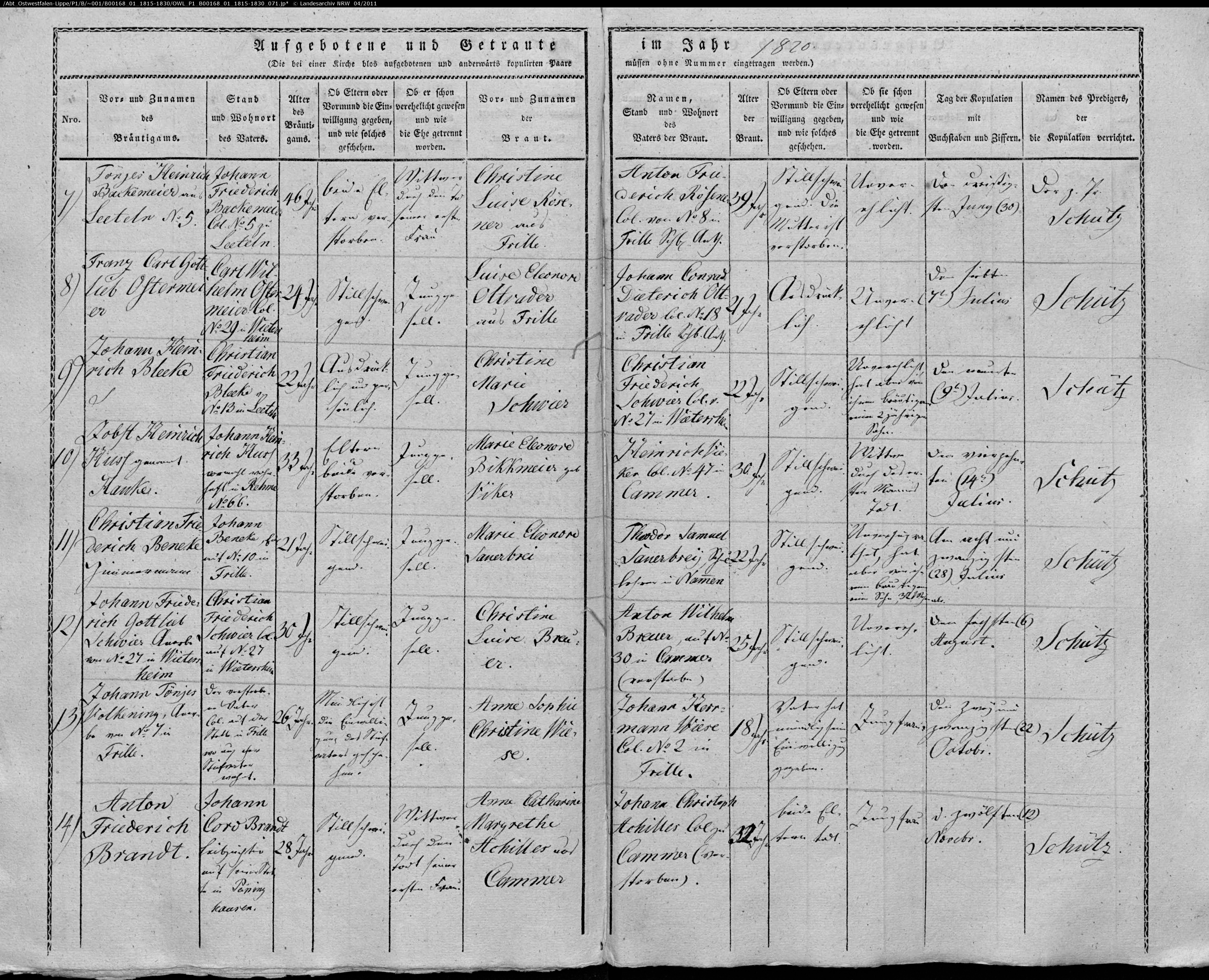 Evangelische Gemeinde Frille, Kreis Minden, "Aufgebotene und Getraute im Jahr 1820", entry #9 for Johann Heinrich Bleeke and Christine Marie Schwier, married 9 July 1820, Kirchenbuchduplikat, B 168 (GHT 1815–1830), Personenstandsarchiv Westfalen-Lippe, Landesarchiv Nordrhein-Westfalen, Abteilung Ostwestfalen-Lippe, Detmold. Digital images: Landesarchiv NRW, https://www.archive.nrw.de (accessed 6 December 2025).