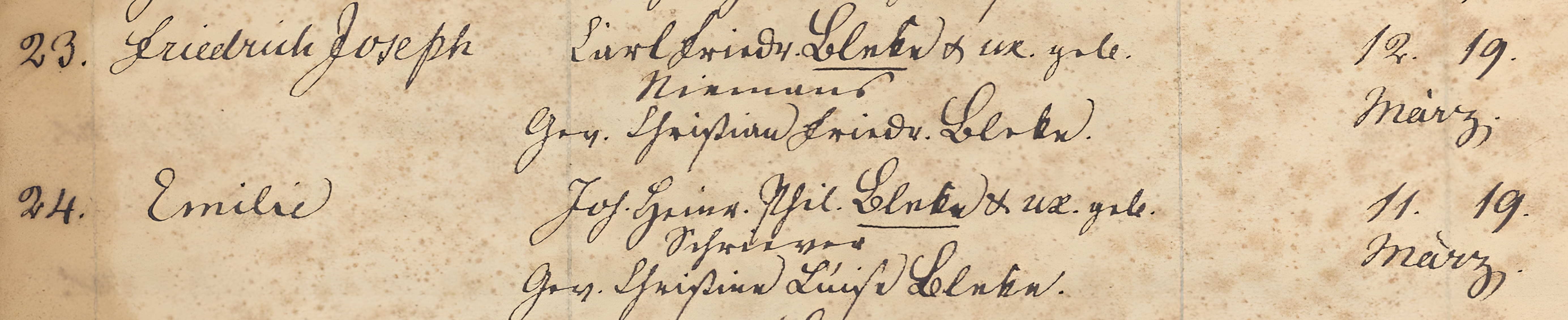 The baptism record is on page 42, of volume 1, of the PDF of the Kirchenbuch of the Deutsche Evangelisch-Lutherische und Reformierte Kirche (North German Lutheran Church) of Cincinnati.