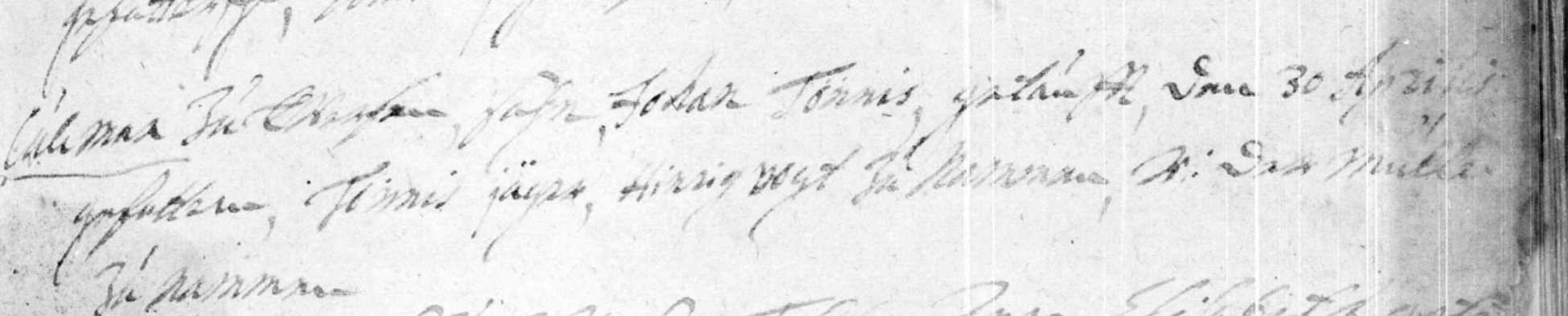 Cuhman [?????], son, Johann Tonnis, baptized, on the 30 April Baptism Sponsors, Tonnis Jäger, Hi[nrig] Vogt at Namnen, [?] the miller at Nammen.