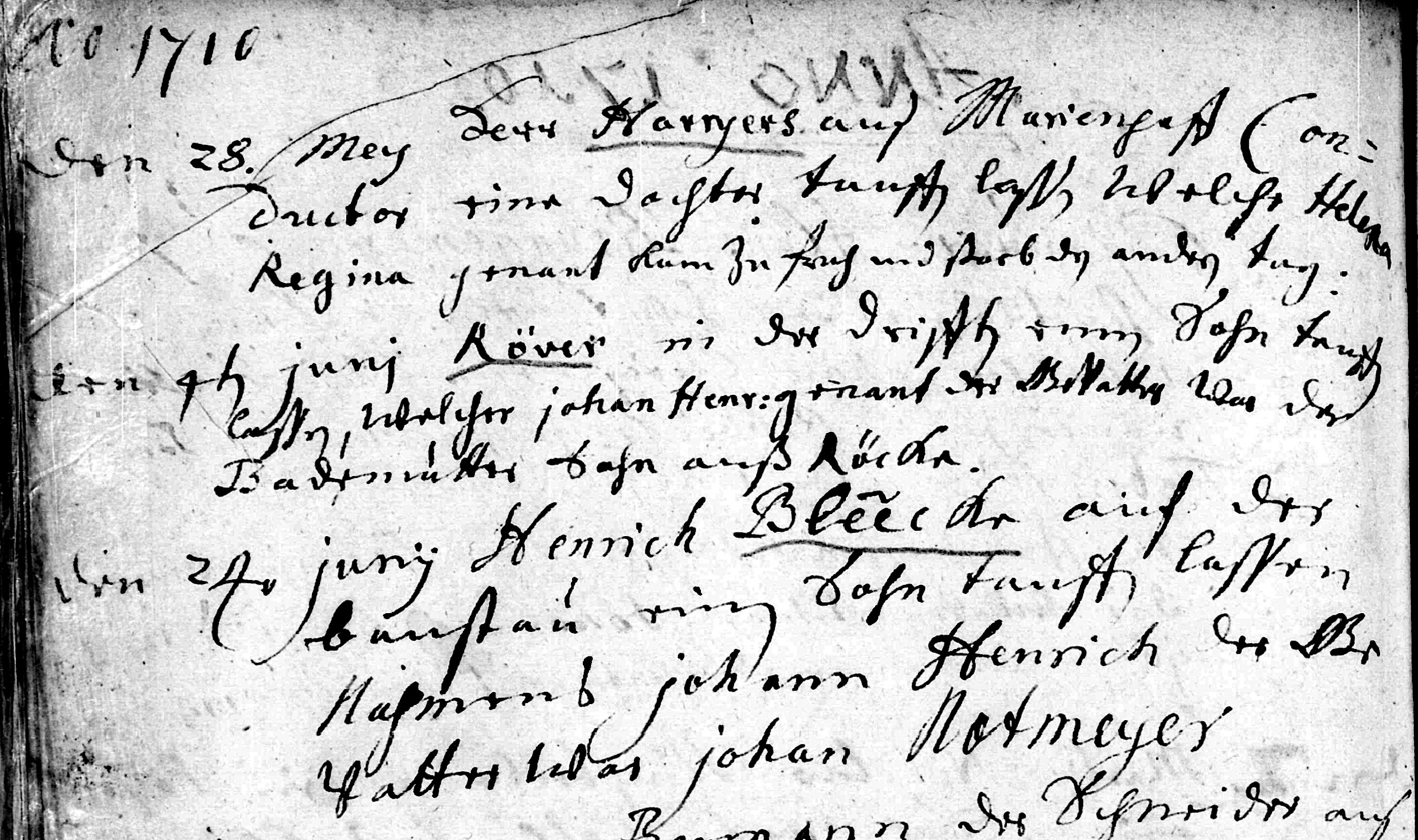 den 24 Junÿ Henrich Bleecke aus/auf der banstans/banstau ein Sohn tauft lassen Nahmens Johann Henrich der Gevatter war Johan Notmeyer