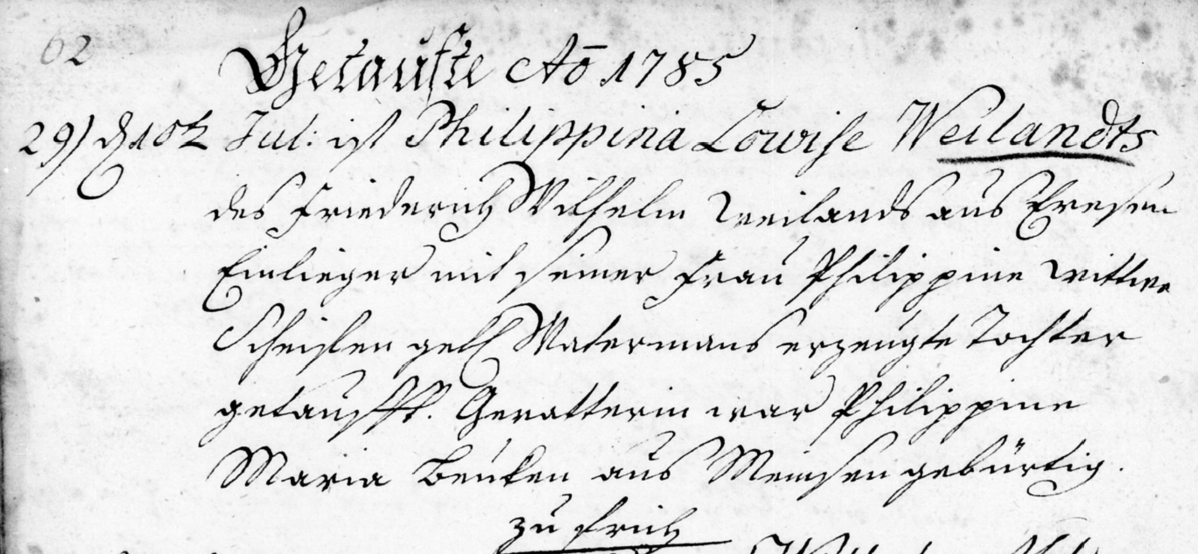 This entry of the birth of Philippine Louise Weiland, in 1785, occurs on the left hand page, page 62.