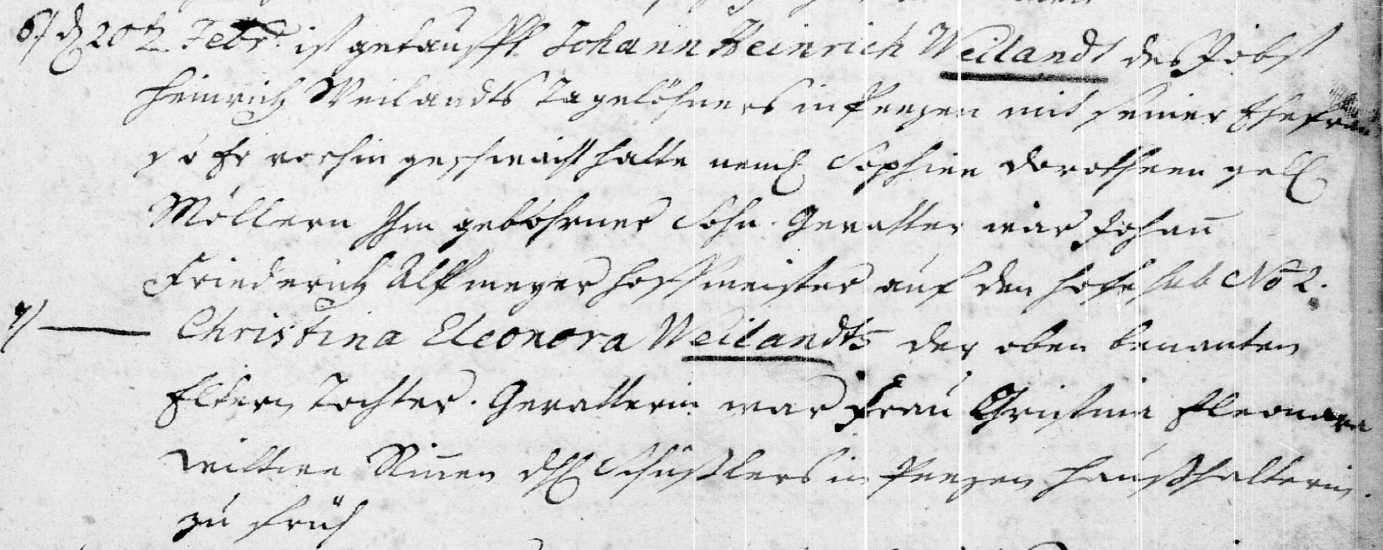 6) On Febr. 20th Johann Heinrich Weiland was baptized, the son of Jobst
