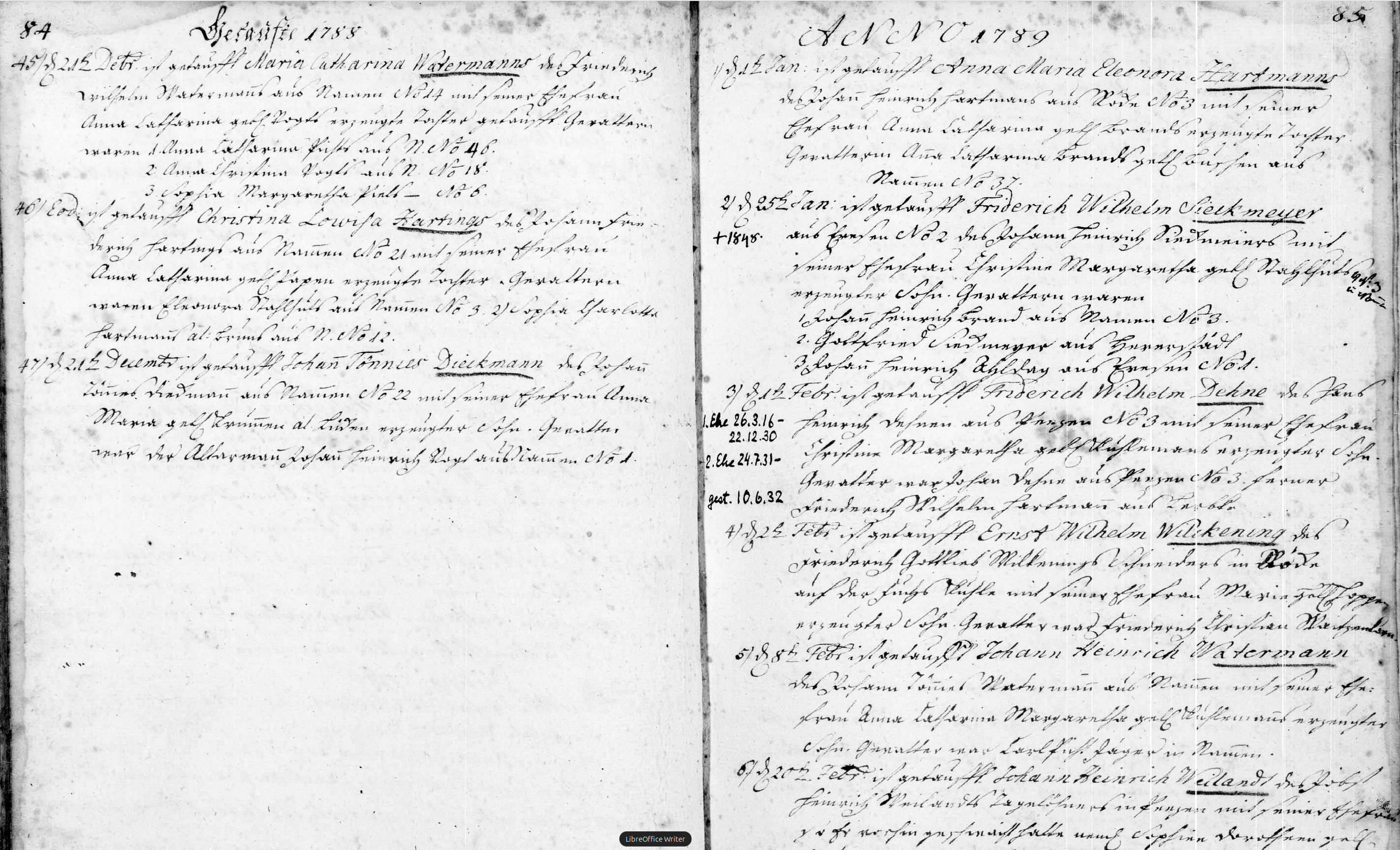 Below is an overview of both pages 84 and 85, showing page 84 covers 1788 and page 85 covers the year 1789, starting with the month of January for the first entry of page 85.
