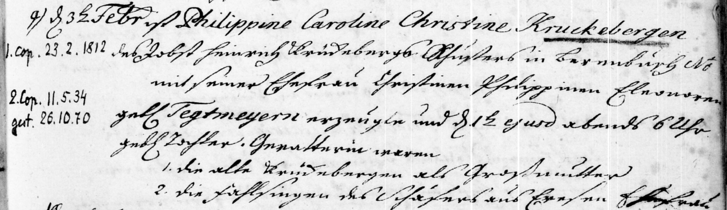 1. married 2/23/1812 Berenbusch No. 10, and his wife Christine Philippine Eleonore, née Tegtmeyern, was baptized.