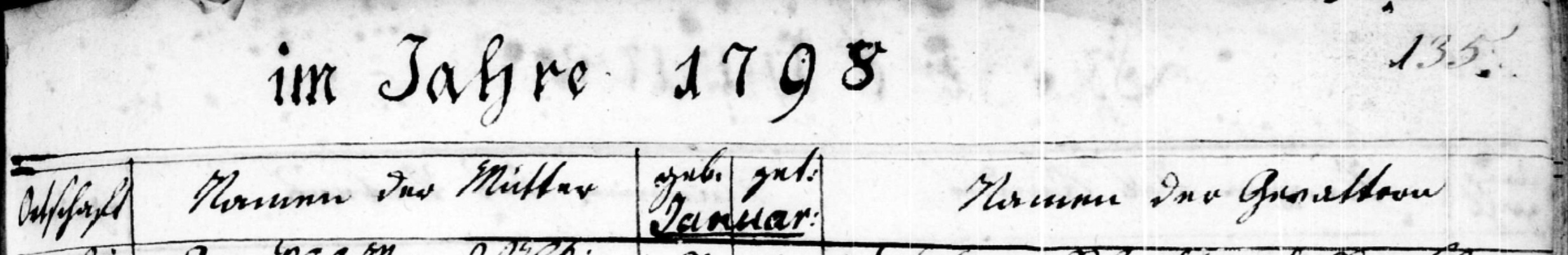 | Anzahl | Namen des Kindes | Namen des Vaters | Haus Nro | Orstschaft | Namen der Mutter | geb. Januar |