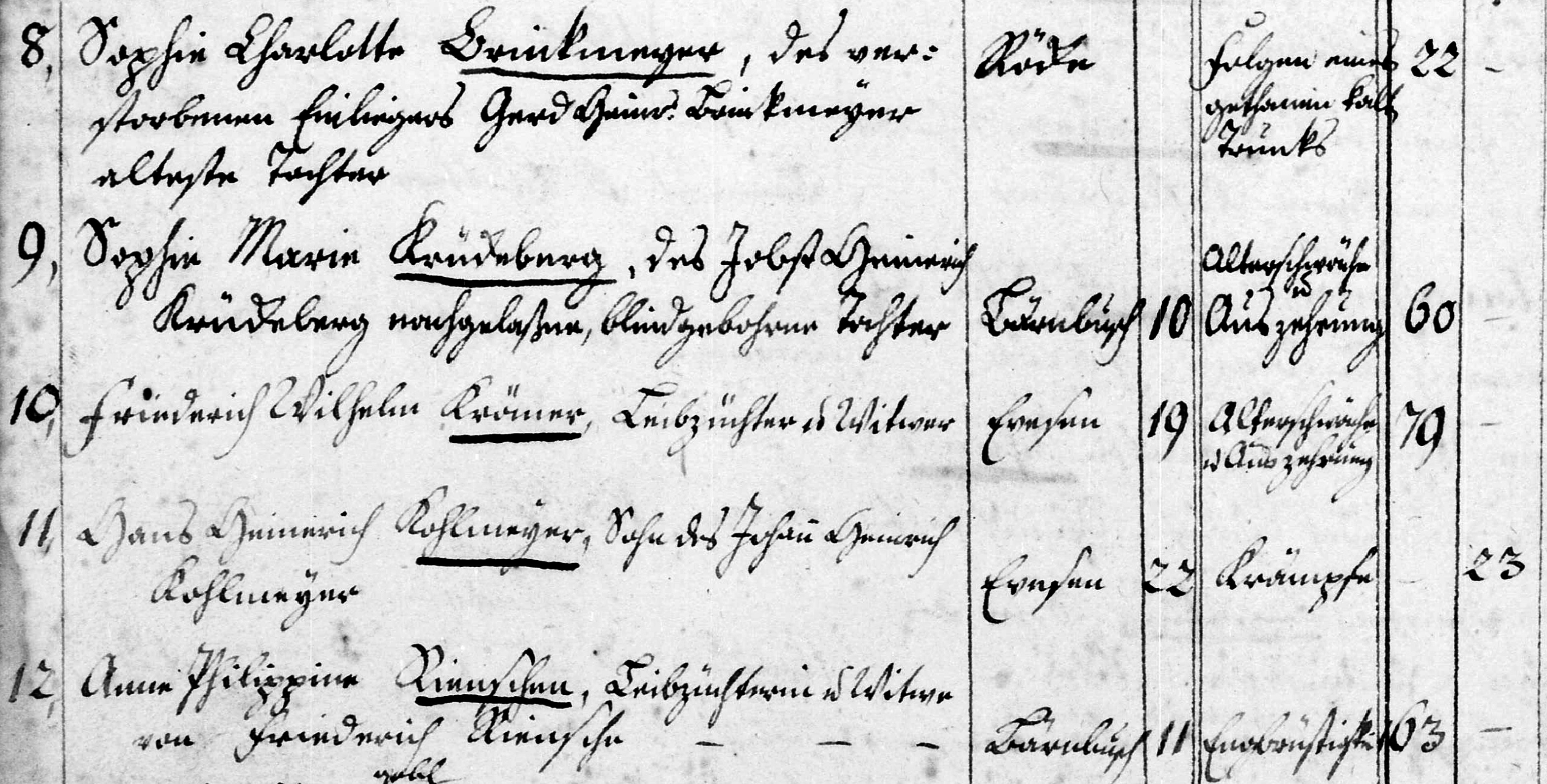 It is very probable that Jobst is incorrect, a scribal error, or the use of Tochter (daughter) meant "family daughter” in the social sense. Jobst Heinrich Krückeberg did live at no. 10 Berenbusch, but he was born in 1765, and thus only age 36 when Sophie Marie died in her 60th year. No. 10 Berenbusch was also the home of Johann Heinrich Krückeberg, Jobst Heinrich’s father. The burial entry names Jobst Heinrich Krückeberg as the household reference person (nachgelassen), indicating that Sophie Marie belonged to his household at the time of her death. She was not a biological daughter of Jobst Heinrich, who was 25 years her junior. Tochter then can be best understood in a social/household sense. Her biological father was almost certainly Johann Heinrich Krückeberg (†1759). |