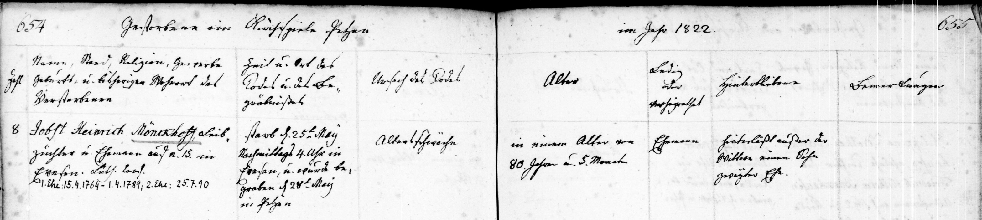 The death of Jobst Heinrich Krückeberg, on October 21, 1822, is recorded on image 314, on pages 654 and 654 of Petzen Kirchenbuch: Verzeichnis der Getauften, Konfirmierten, Getrauten und Gestorbenen 1785-1827.