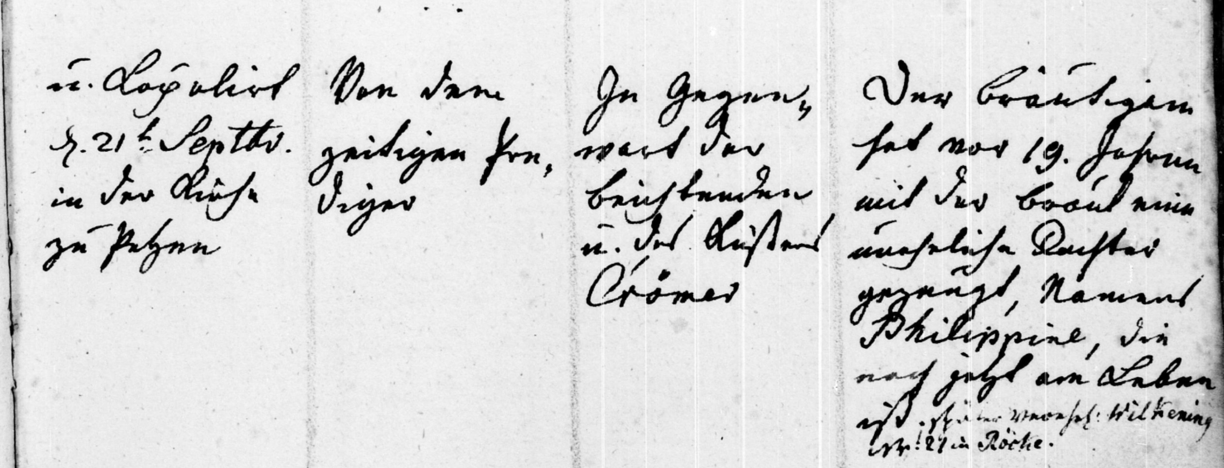 der Bräutigam hat [??] 19 Jahren mit der Braut eine uneheliche Tochter gezeugt, Names Phlippine, die noch jetzt am Leben ist. [unclear phrases] Wilkening [??] 27 in Röcke |