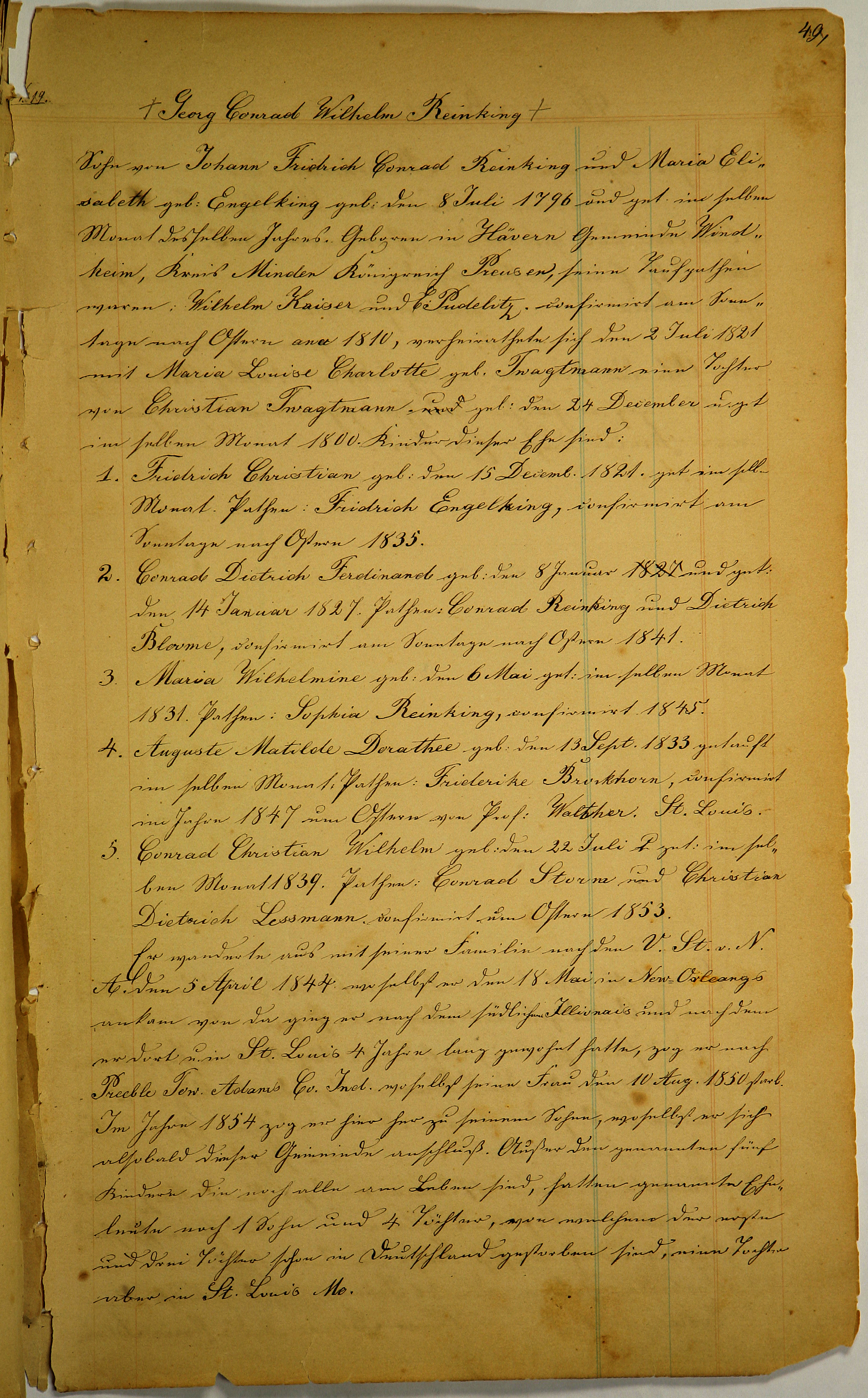 4. Auguste Matilde Dorathee, geb. den 13 September 1833, getauft im selben Monat. Pathen: Friderike Brockhorn, confirmiert im Jahre 1847 um Ostern von Pastor Walther, St. Louis.
