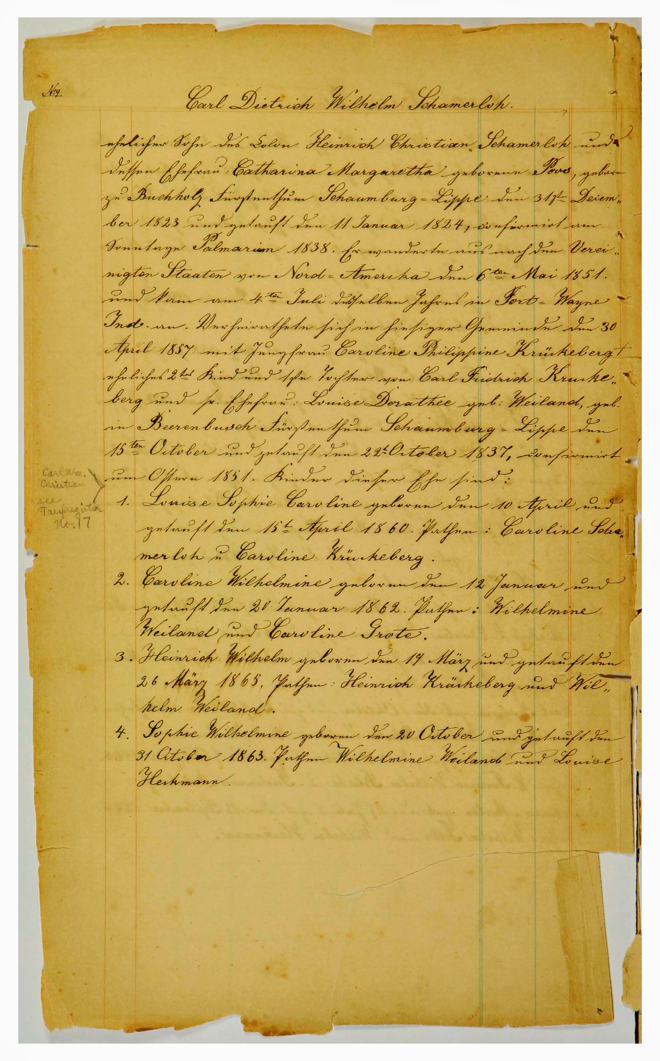 ehelicher Sohn des Colon Heinrich Christian Schamerloh und dessen Ehefrau Catharina Margaretha geb. Poos, geboren zu Buchholz (Buchholz bei Stadthagen, Schaumburg) Fürtsenthum Schaumburg-Lippe den 31. Dezember 1823 und getauft den 11. Januar 1824, confirmiert am Sonntage Palmarium 1838. Er wanderte aus nach den Vereinigten Staaten von Nord-Amerika den 6. Mai 1851, und kam am 4. Juli deselben Jahres in Fort Wayne Ind. an. Verheirathete sich in hiesiger Gemeinde den 30. April 1857 mit Jungfrau Caroline Philippine Krückeberg, eheliches 2tes Kind und 1ste Tochter von Carl Fridrich Krückeberg und seiner Ehefrau Louise Dorathea neé Weiland, geb. in Beerenbusch (Berenbusch) Fürstenthum Schaumburg-Lippe, den 15ten Oktober und getauft den 22ten Oktober 1837, confirmiert um Ostern 1851.