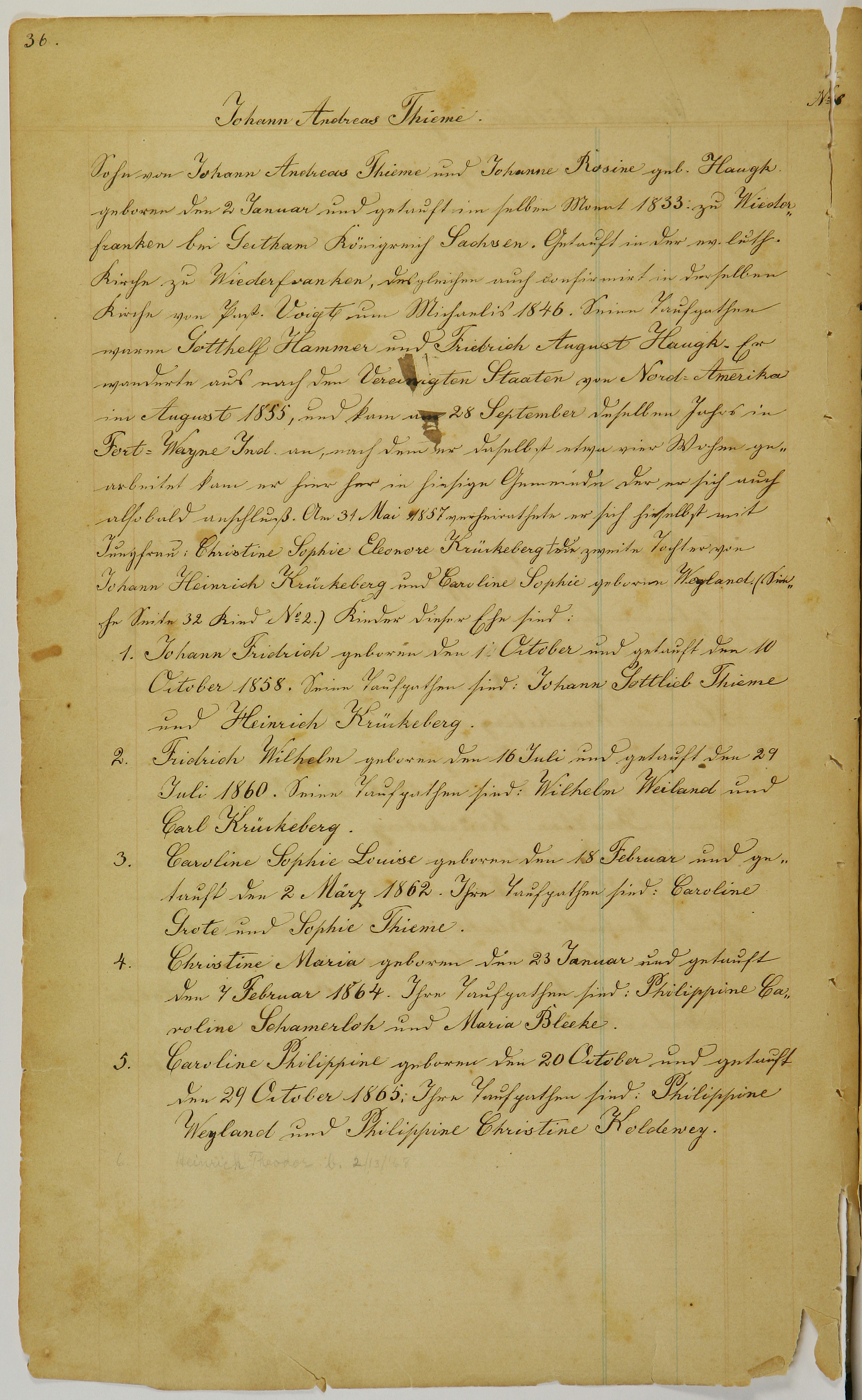 Son of Johann Andreas Thieme and Johanne Rosine neé. Haugk, born in Niederfranken (Niederfrankenhain) near Gaitham (Geithain), Kingdom of Saxonia, on 2 January 1833. He was baptized in the same month at the Protestant Lutheran Church in Niederfranken (Niederfrankenhein). He was confirmed in the same church by Pastor Voigt at Michaelmas 1846. His godparents were Gotthelf Hammer and Fridrich August Haugk.