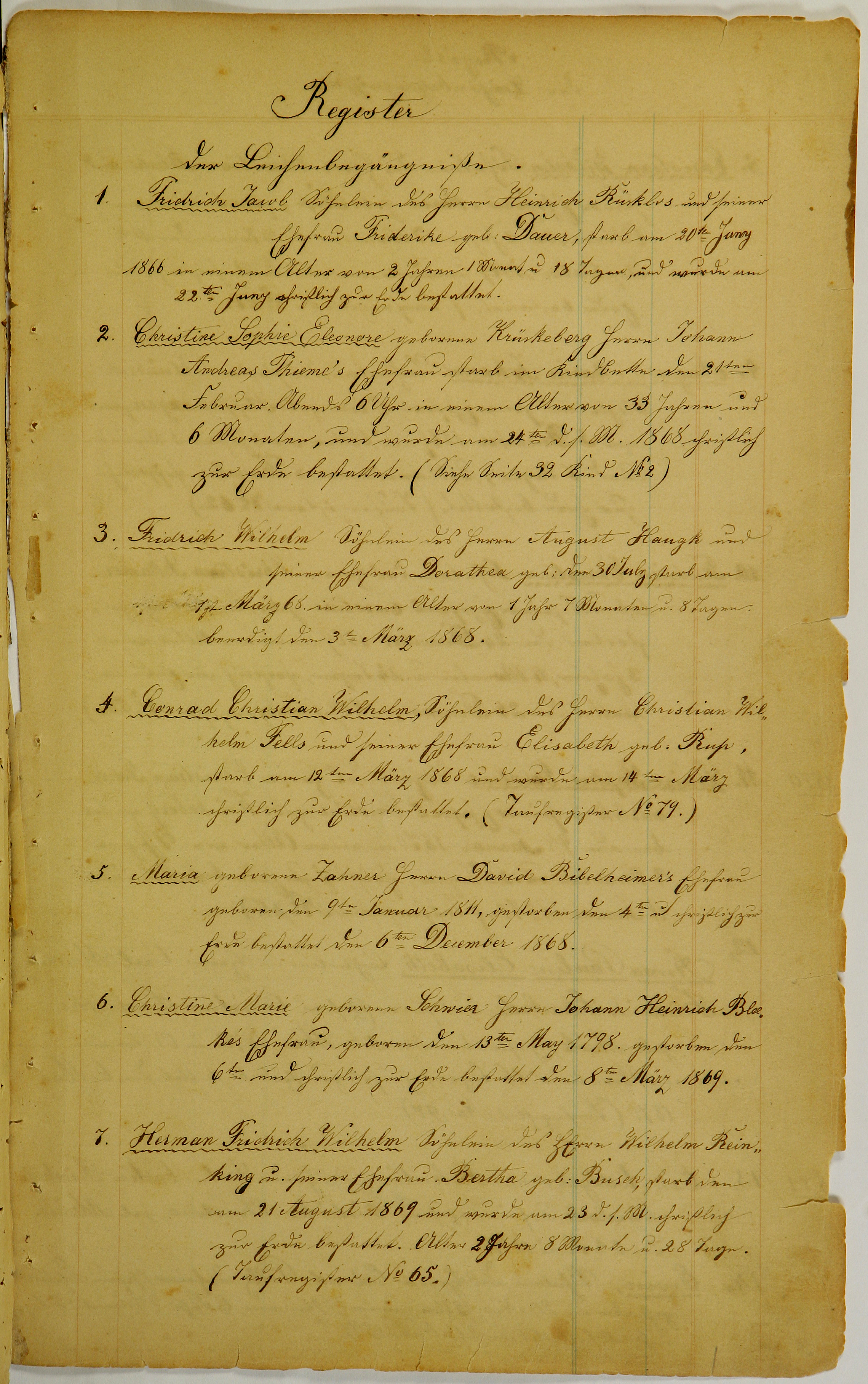 7. Herman Fridrich Wilhelm Söhnlein des Herrn Wilhelm Rein- king und seiner Ehefrau Bertha geb. Busch, starb den am 21 August 1869 und wurde am 23 d. s. M. christlich zur Erda bestattet. Alter 2 Jahre 8 Monate u. 28 Tage. (Taufregiser No 65.)