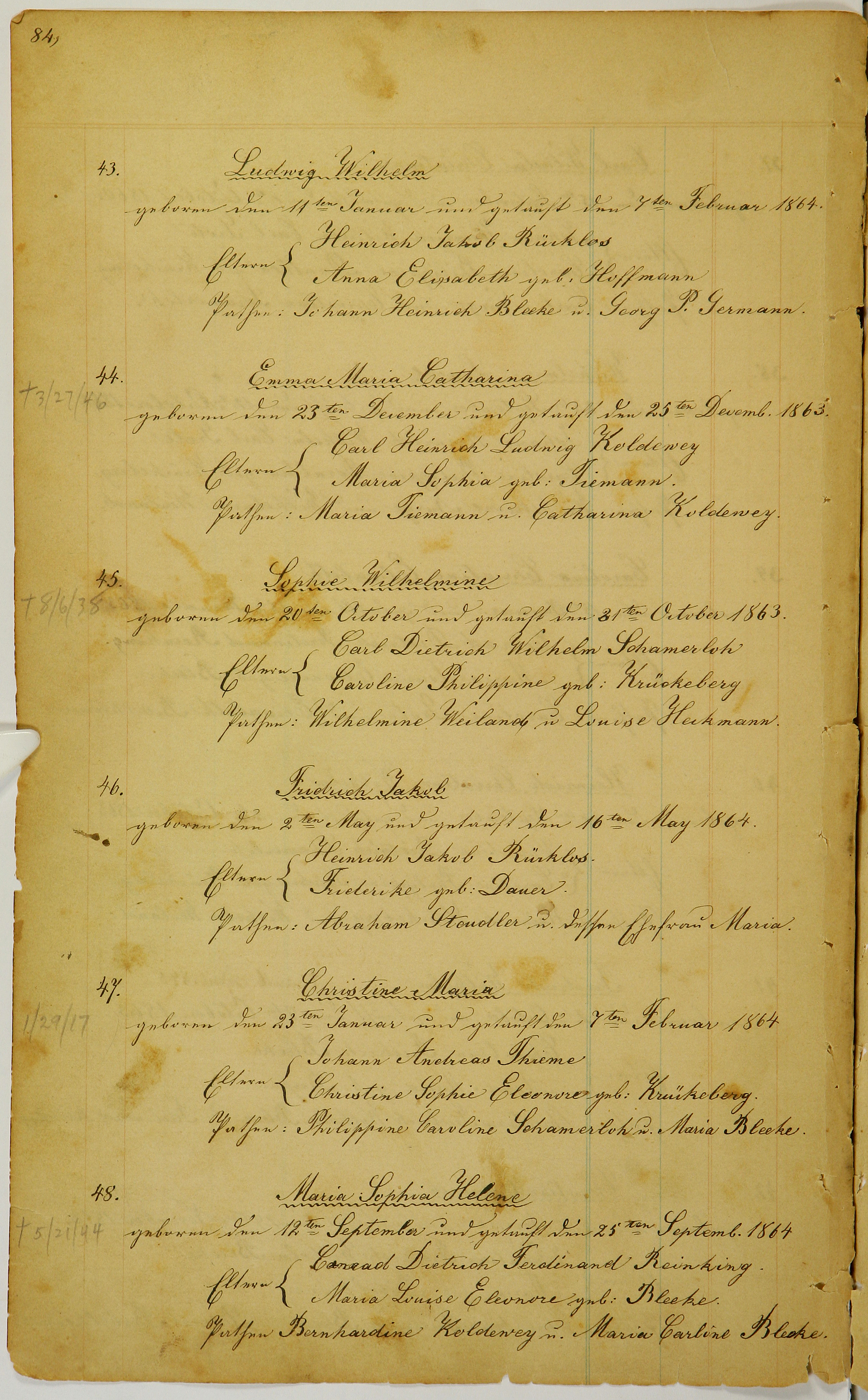 geboren den 11ten Januar und getauft den 7ten Februar 1864.