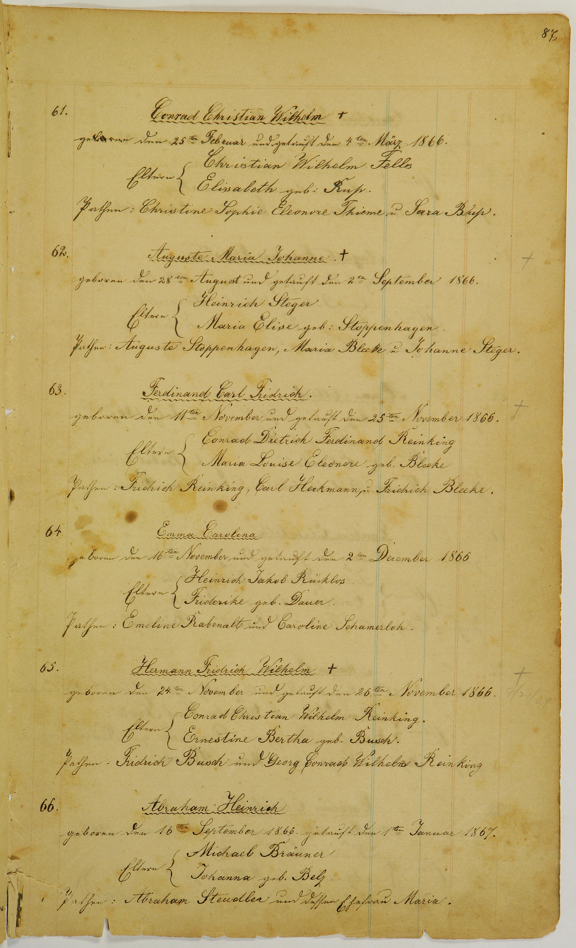 Page 87, #61-66 Figure 1. Page 87, image 56 (Click to enlarge) Transliteration Translation Conrad Christian Wilhelm geboren den 25ten Februar und getauft den 4ten März 1866. Eltern: Christian Wilhelm Fells Elisabeth geb: Rup. Pathen: Christine Sophie Eleonore Thieme u. Sara Bup. Auguste Maria Johanne [+] geboren den 28ten August und getauft den 2ten September 1866. Eltern: Heinrich Steger Maria Elise geb. Stoppenhagen. Pathen: Auguste Stoppenhagen, Maria Bleeke u. Johanne Steger. Ferdinand Carl Fridrich. [+] geboren den 11ten November und getauft den 25ten November 1866 Eltern: Conrad Dietrich Ferdinand Reinking Maria Louise Eleonore geb. Bleeke Pathen: Fridrich Reinking, Carl Heckmann u. Fridrich Bleeke. Emma Carolina geboren den 16ten November und getauft den 2ten December 1866 Eltern: Heinrich Jakob Rücklos Friderike geb. Dauer. Pathen: Emeline Rabenalt und Caroline Schamerloh. Hermann Fridrich Wilhelm [+8/21/09] geboren den 24ten November und getauft den 26ten November 1866. Eltern: Conrad Christian Wilhelm Reinking. Ernestine Bertha geb. Busch. Pathen: Fridrich Busch und Georg Conrad Wilhelm Reinking Abraham Heinrich geboren den 16ten September 1866 getauft den 1ten Januar 1867. Eltern: Michael Bräuner Johanna geb. Belz. Pathen: Abraham Steudler und dessen Ehefrau Maria. Conrad Christian Wilhelm born on February 25th and baptized on March 4th, 1866. Parents: Christian Wilhelm Fells Elisabeth née Rup. Godparents: Christine Sophie Eleonore Thieme and Sara Bup. Auguste Maria Johanne [+] born on August 28th and baptized on September 2nd, 1866. Parents: Heinrich Steger Maria Elise née Stoppenhagen. Godparents: Auguste Stoppenhagen, Maria Bleeke and Johanne Steger. Ferdinand Carl Fridrich. [+] born on November 11th and baptized on November 25th, 1866 Parents: Conrad Dietrich Ferdinand Reinking Maria Louise Eleonore née Bleeke Godparents: Fridrich Reinking, Carl Heckmann and Fridrich Bleeke. Emma Carolina born on November 16th and baptized on December 2nd, 1866 Parents: Heinrich Jakob Rücklos Friderike née Dauer. Godparents: Emeline Rabenalt and Caroline Schamerloh. Hermann Fridrich Wilhelm [+8/21/09] born on November 24th and baptized on November 26th, 1866. Parents: Conrad Christian Wilhelm Reinking. Ernestine Bertha née Busch. Godparents: Fridrich Busch and Georg Conrad Wilhelm Reinking. Abraham Heinrich born on September 16th, 1866, baptized on January 1st, 1867. Parents: Michael Bräuner Johanna née Belz. Godparents: Abraham Steudler and his wife Maria. Page 86, #55-60 Page 88, #67-72