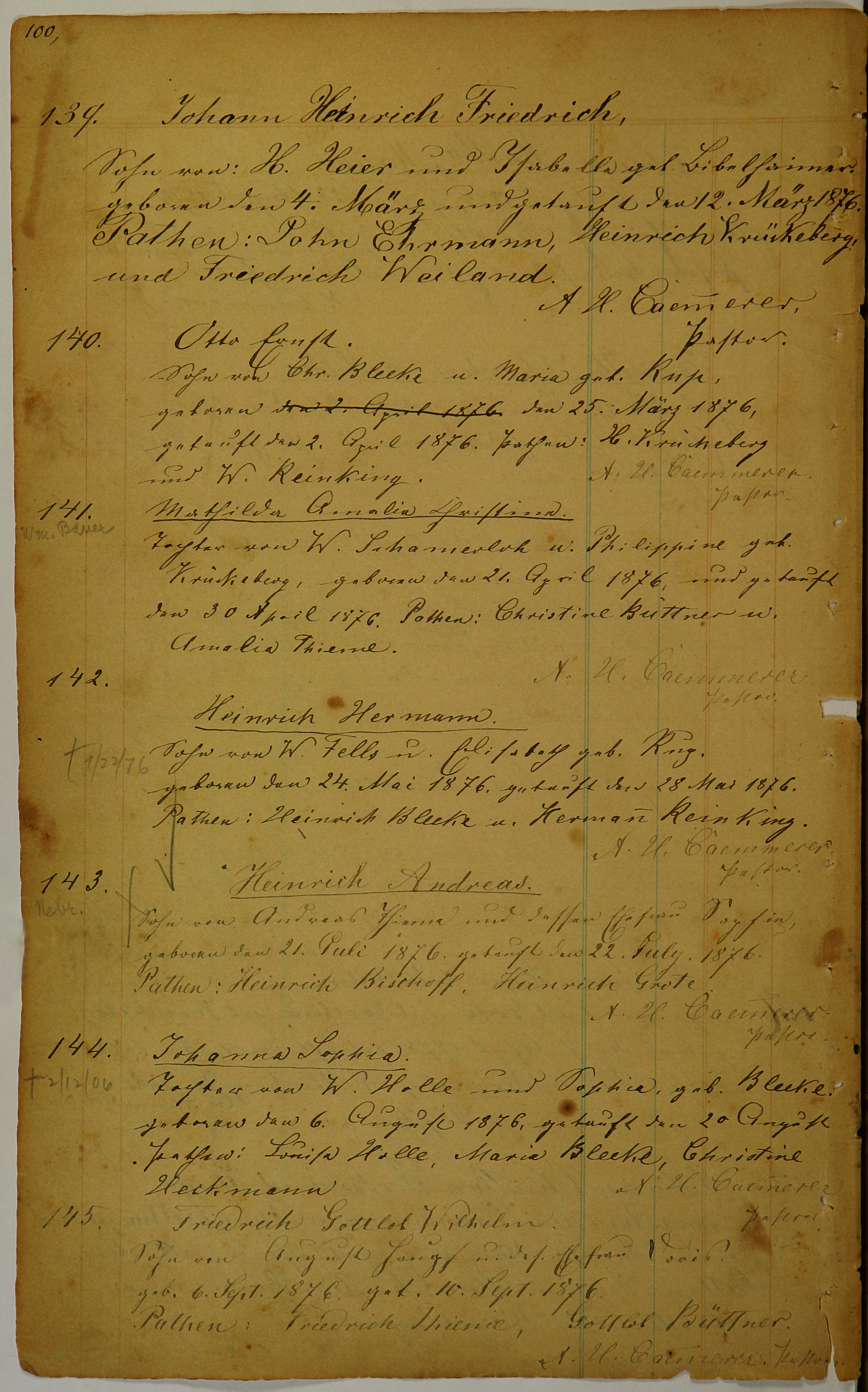 geboren den 4. März und getauft den 12. Mörz 1876.