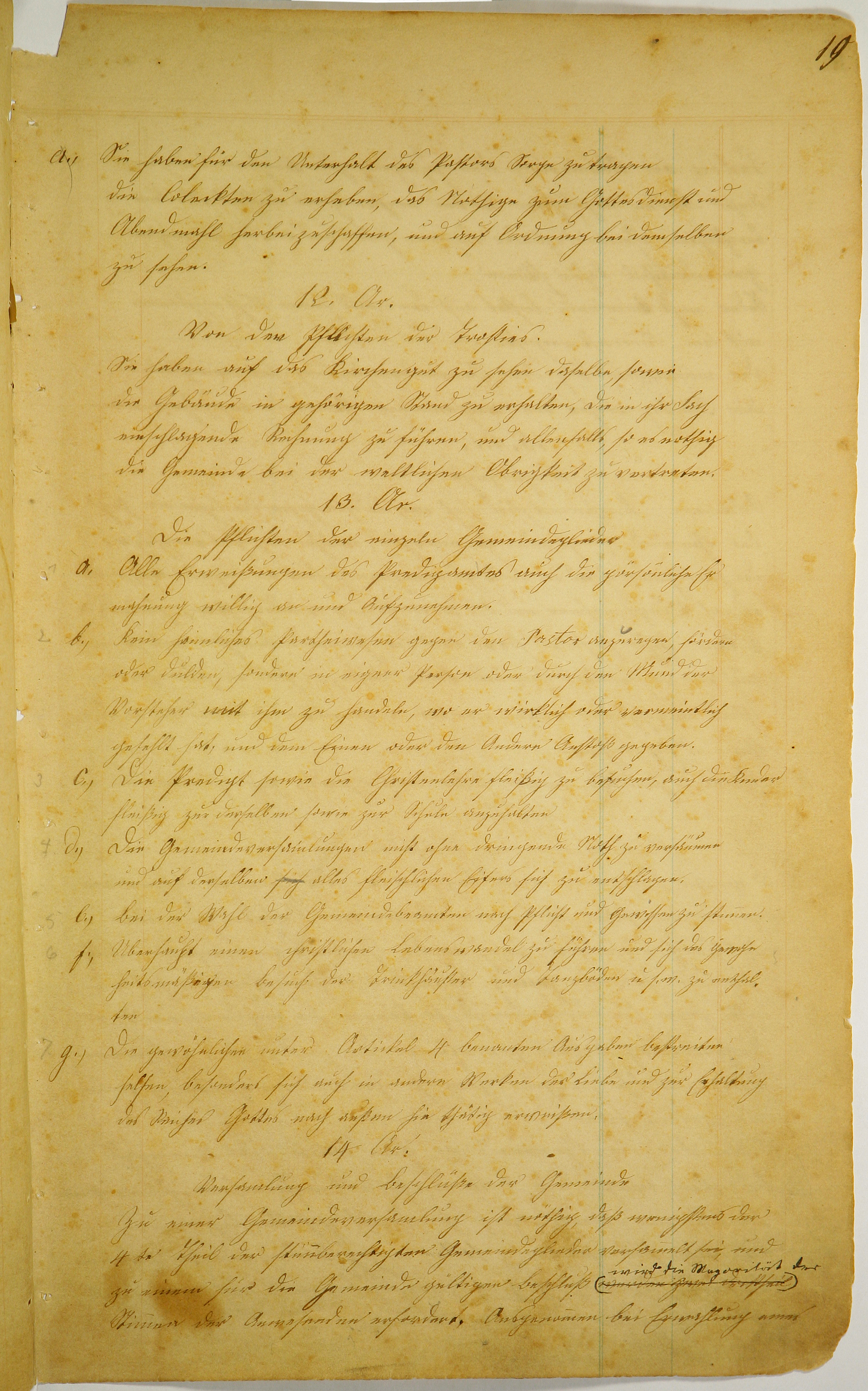 A congregational meeting requires that at least one quarter of the voting members be present, and a decision is valid only if it receives a majority of the votes of those present. Ausgenommen bei Erwählung [uncertain]…​