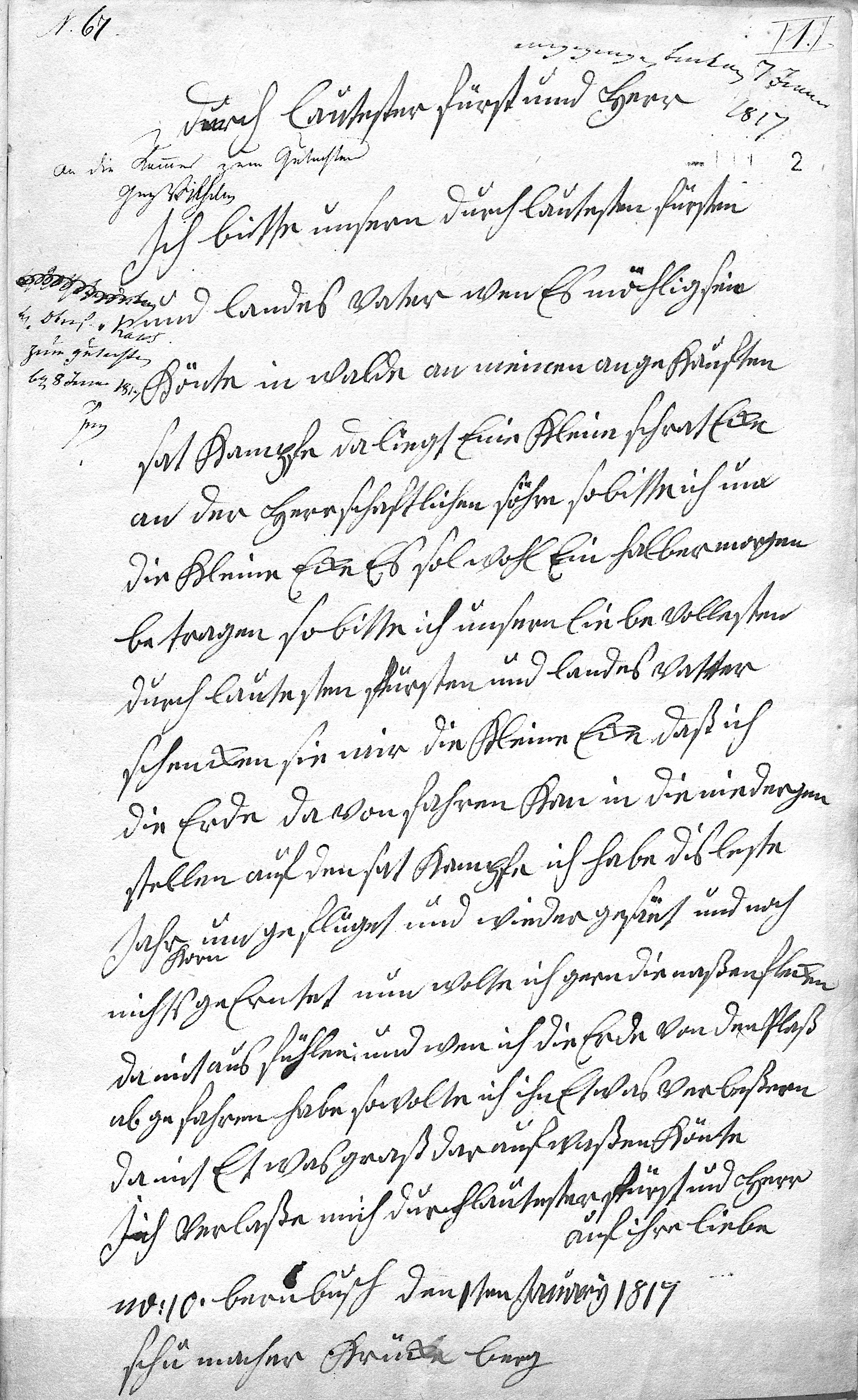 No. 67 1 Received in Bückeburg 7 June 1817 [Resolution / routing instruction] To the Chamber for an opinion. Georg Wilhelm [?] Chief Forester Kaas for review [unreadable] 8 June 1817 [initials] Most Serene Prince and Lord, I ask our Most Serene Prince and Father of the Land, if it might be possible, with regard to my purchased field in the forest—there lies a small slanted corner next to the princely woodland called the Söhre—that I might receive this small corner. It probably amounts to about half a Morgen. Therefore I ask our most gracious and beloved Most Serene Prince and Father of the Land: grant me the small corner so that I may take soil from there and fill in the low places in my field. Last year I ploughed it and sowed it again, yet still harvested no grain. Now I would gladly fill the wet spots with that soil; and when I have taken the earth away from that place, I would also improve it so that some grass might grow there. I rely, Most Serene Prince and Lord, upon Your kindness. No. 10 Berenbusch, 1 January 1817 Schuster Krückeberg
