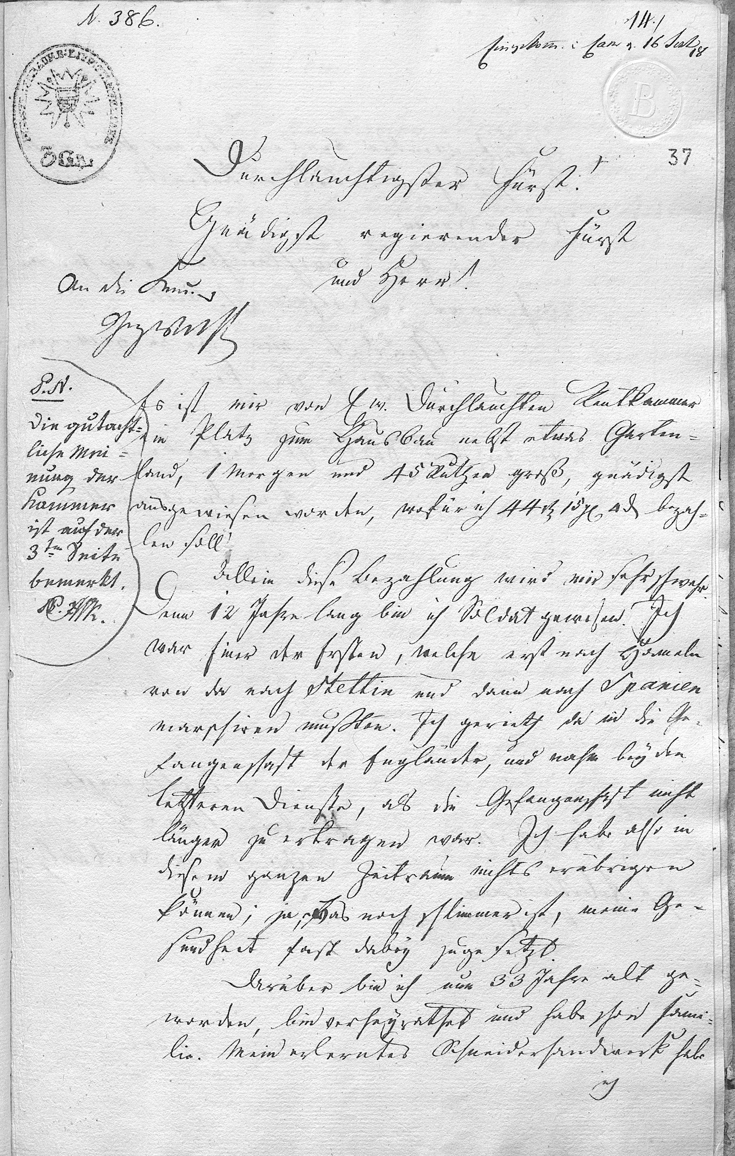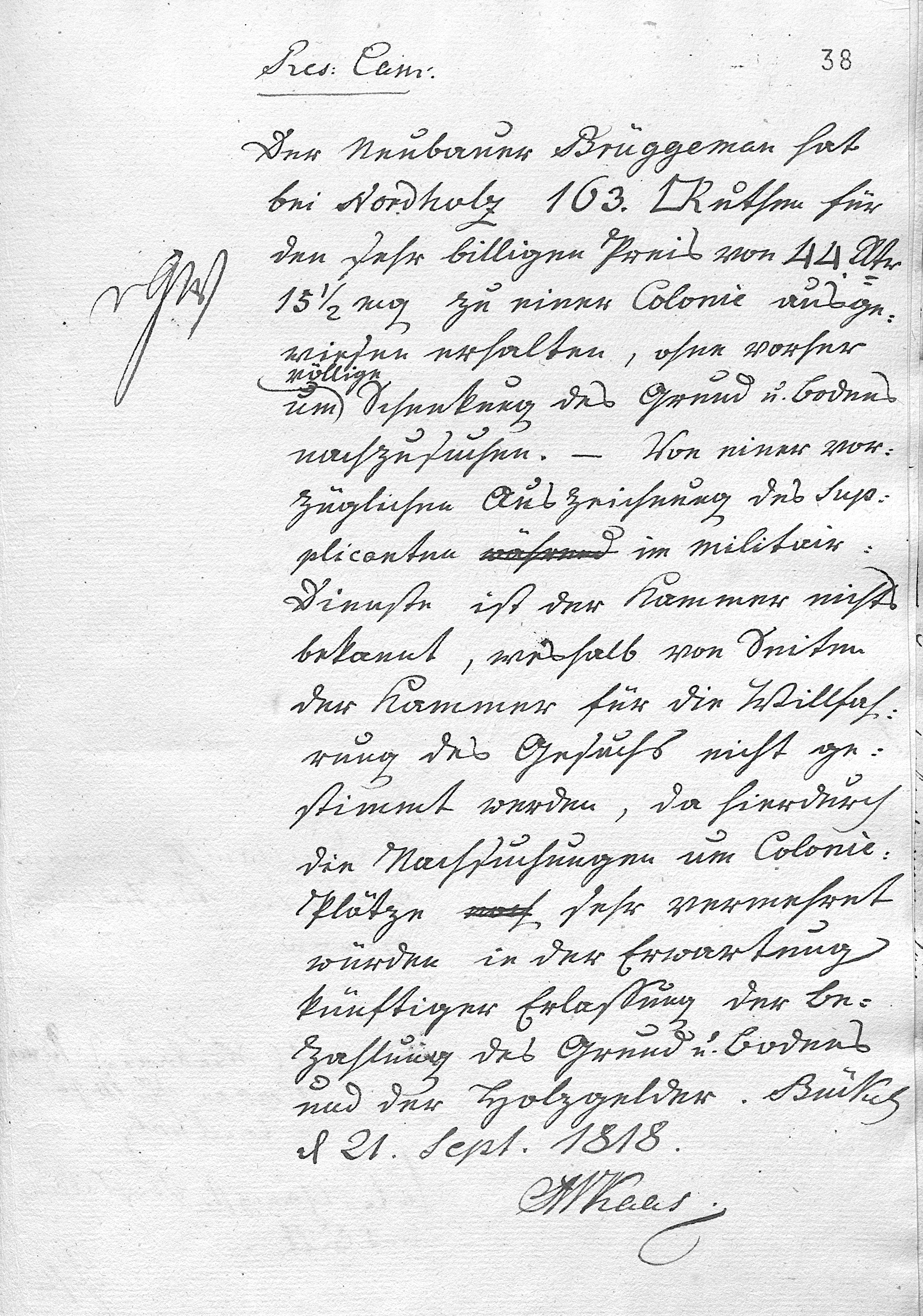 3 Gr. Stempel An die Cammer [routing/handling notation] P. N. Die gutachtliche Meinung der Kammer ist auf der 3ten Seite bemerkt. N. MKaas. Durchlauchtigster Fürst Gnädigst regierender Fürst und Herr! Es ist mir von Ew. Durchlauchten Rentkammer ein Platz zum Hausbau nebst etwas Gartenland, 1 Morgen und 45 Ruthen groß, gnädigst ausgewiesen worden, wofür ich 44 rt 15 gl 4 d bezahlen soll. Allein diese Bezahlung wird mir sehr schwer. Denn 12 Jahre lang bin ich Soldat gewesen. Ich war Einer der Ersten, welche erst nach Hameln von da nach Stettin und dann nach Spanien marschiren mußten. Ich gerieth da in die Gefangenschaft der Engländer, und nahm beÿ den letzteren Dienste, als die Gefangenschaft nicht länger zu ertragen war. Ich habe also in diesem ganzen Zeitraum nichts erübrigen können, ja, das noch schlimmer ist, meine Gesundheit fast dabeÿ zugesetzt. Darüber bin ich nun 33 Jahre alt geworden, bin verheÿrathet und habe schon Familie. Mein erlerntes Schneiderhandwerk habe ich fast wieder verlernet, und kann nicht darauf rechnen, etwas bedeutendes damit zu verdienen. An Ew. Durchlauchten ergehet demnach meine unterthänigste Bitte: Gnädigst mir den ausgewiesenen Platz zu schenken. In tiefster Ehrfurcht ersterbe ich Ew. Durchlauchten unterthänigster Neubauer Brüggemann No 14 zu Nordholz Suppl. Bbrg d 3t Feb: 1818. Opt. Adv. Alwellmann n g n Vert. eGW [left margin] Res: Cam: Der Neubauer Brüggemann hat bei Nordholz 103. Ruthen für den sehr billigen Preis von 44. Rthlr. 15 ½ mg zu einer Colonie ausgewiesen erhalten, ohne vorher um völlige Schenkung des Grund u. Bodens nachzusuchen. Von einer vorzüglichen Auszeichnung des Supplicanten im militairen Dienste ist der Kammer nichts bekannt, weshalb von Seiten der Kammer für die Willfahrung des Gesuchs nicht gestimmt werden, da hierdurch die Nachsuchungen um Colonie-Plätze sehr vermehret würden in der Erwartung künftiger Erlassung der Bezahlung des Grund u. Bodens und der Holzgelder. Bückub d 21. Sept. 1818. MKaas