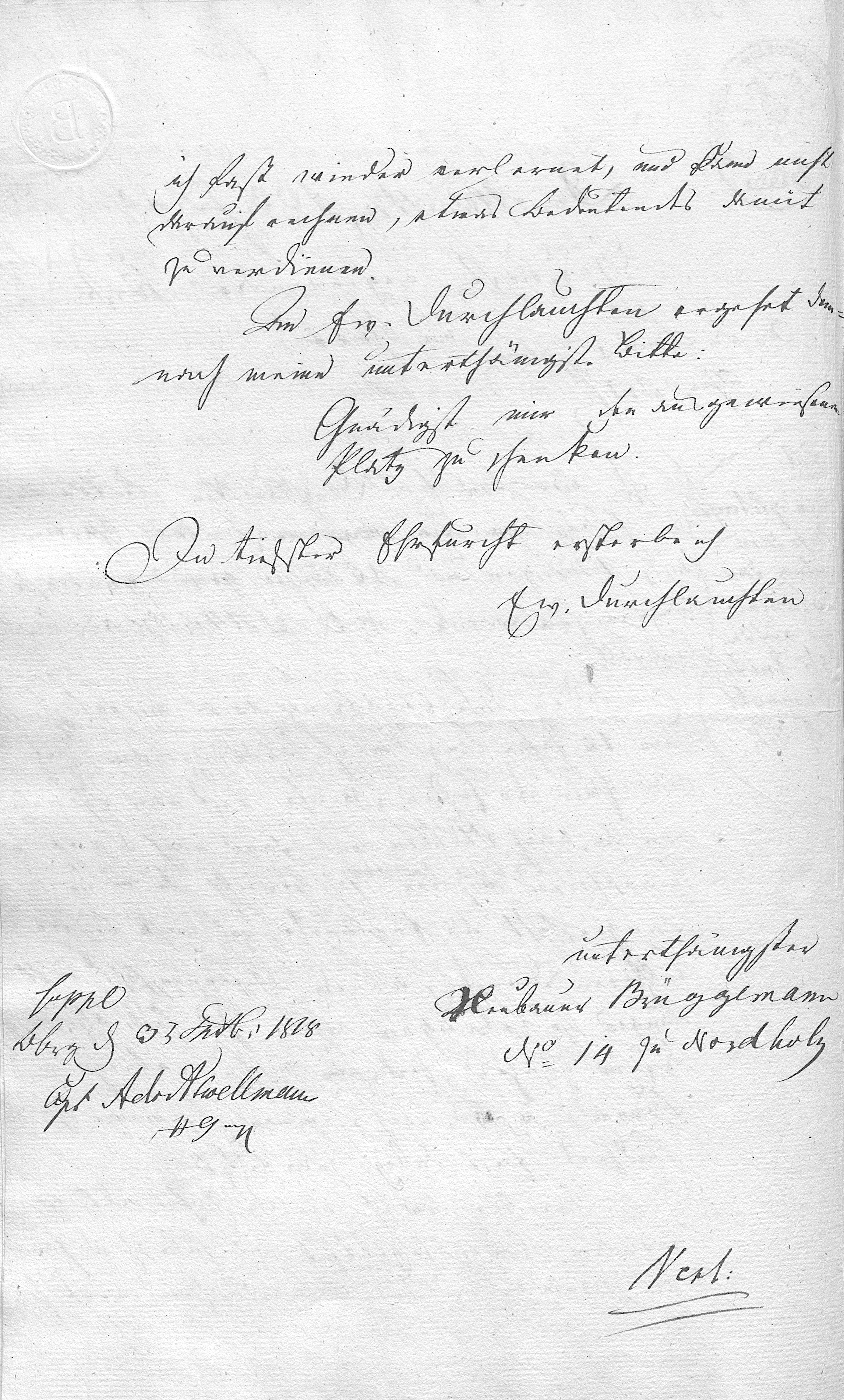 An Se. Durchlaucht, meinem gnädigsten Fürsten und Herrn des Neubauers Brüggemann No 14 zu Nordholz Unterthänigste Vorstellung und Bitte: Ich um einen ausgewiesenen Platz gnädigst zu schenken |