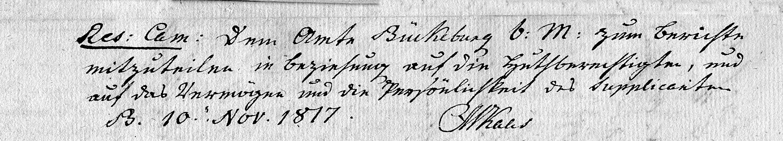 Res: Cam: Dem Amte Bückeburg b: M: zum Berichte mitzuteilen in Beziehung auf die Huthberechtigten, und auf das Vermögen und die Persönlichkeit des Supplicaten B. 10 Nov. 1817 MKaas