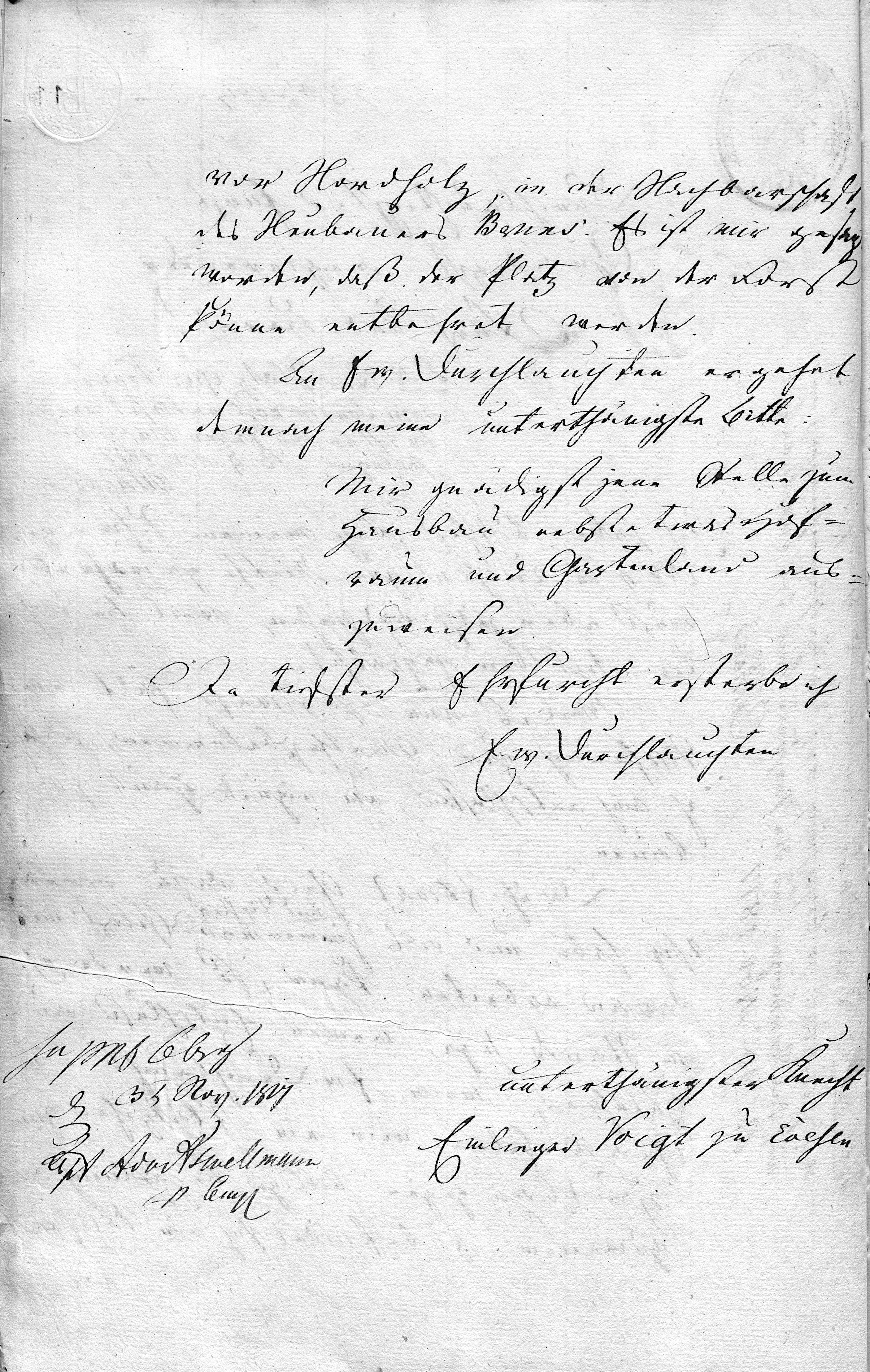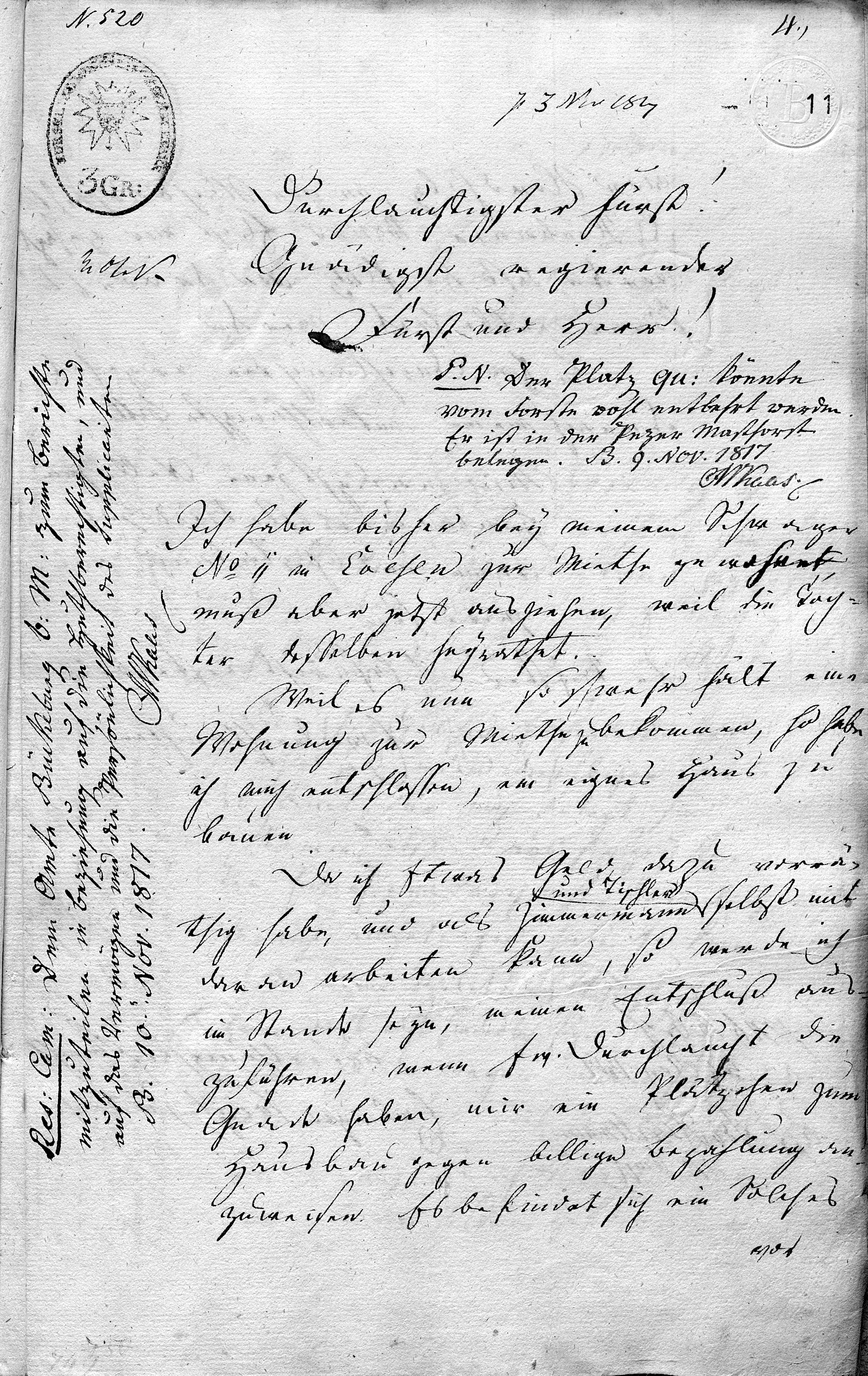 N. 520 4. [3 GR Stempel] [initials] p[räsentiert] 3 Nov 1817 Durchlauchtigster Fürst! Gnädigst regierender Fürst und Herr! P. N. Der Platz qu: könnte vom Forste wohl entbehrt werden. Er ist in der Pezer Mastforst belegen. B[ückeburg]. 9. Nov. 1817. MKaas. Ich habe bisher beÿ meinem Schwager No 11 in Evesen zur Miethe gewohnt, muß aber jetzt ausziehen, weil die Tochter desselben heÿrathet. Weil es nun so schwehr hält, eine Wohnung zur Miethe zu bekommen, so habe ich mich entschlossen, ein eignes Haus zu bauen. Da ich etwas Geld, dazu vorrätig habe, und als Zimmermann und Tischler selbst mit daran arbeiten kann, so werde ich im Stande seyn, meinen Entschluß auszuführen, wenn Ew. Durchlaucht die Gnade haben, mir ein Plätzchen zum Hausbau gegen billige Bezahlung anzuweisen. Es befindet sich ein Solches vor Nordholz, in der Nachbarschaft des Neubauers Bruns. Es ist mir gesagt worden, daß der Platz von der Forst könne entbehrt werden. An Ew. Durchlauchten ergehet demnach meine unterthänigste Bitte: Mir gnädigst jene Stelle zum Hausbau nebst etwas Hofraum und Gartenland auszuweisen. Da tiefster Ehrfurcht ersterbe ich Ew. Durchlauchten unterthänigsten Knecht Einlieger Voigt zu Evesen suppl Bbg 3t Nov. 1817 [various initials]