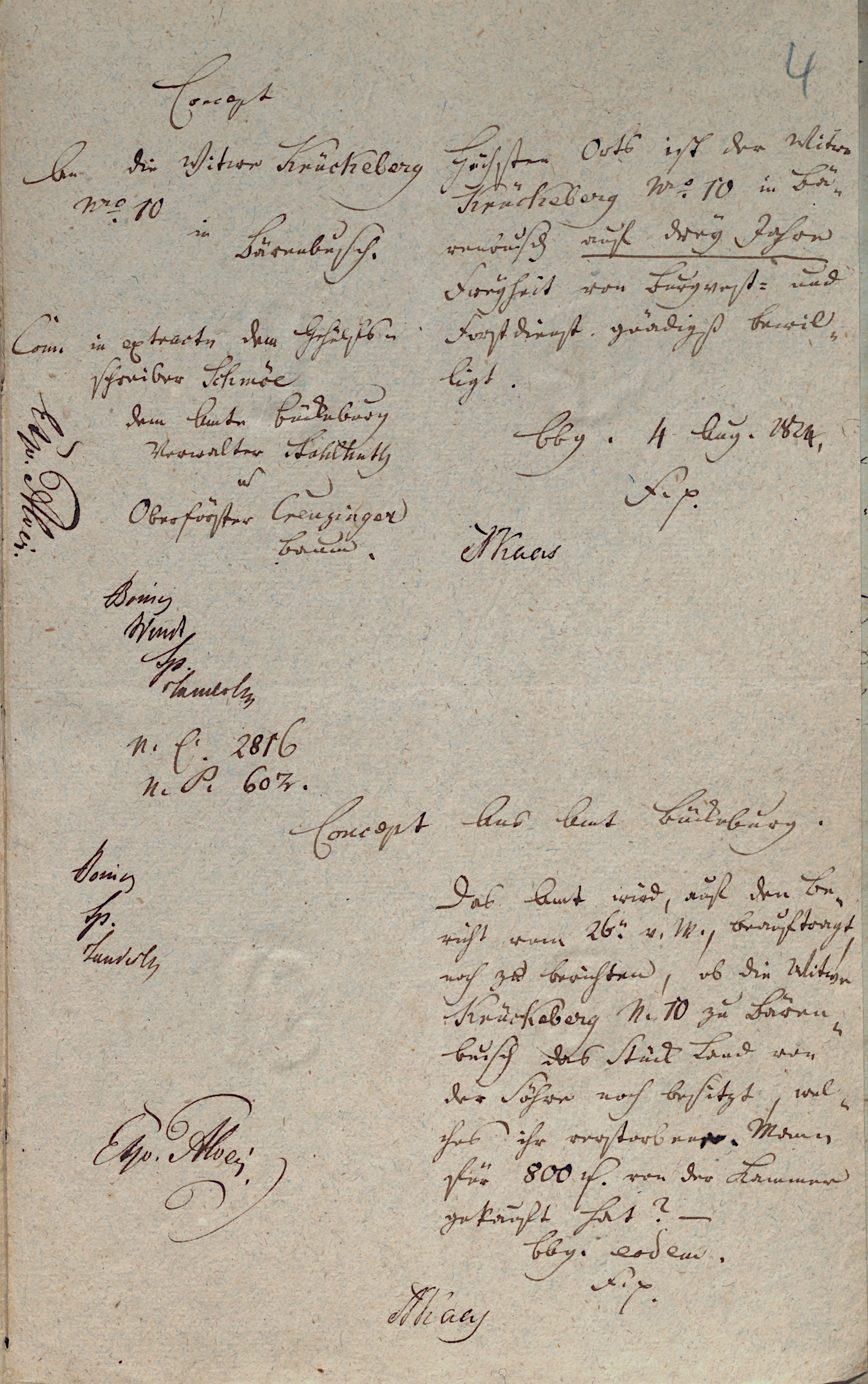 Boines Sp. Tamerlin Concept from the Office of Bückeburg The Office is instructed, on the basis of the report of the 26th of the previous month, to report further whether the widow Krückeberg, No. 10 in Bärenbusch, still possesses the piece of land near the Söhren which her late husband purchased from the Chamber for 800 rixthalers? [Dispatched by Alveÿ] Bückeburg, same date. For the record. A. Kaas