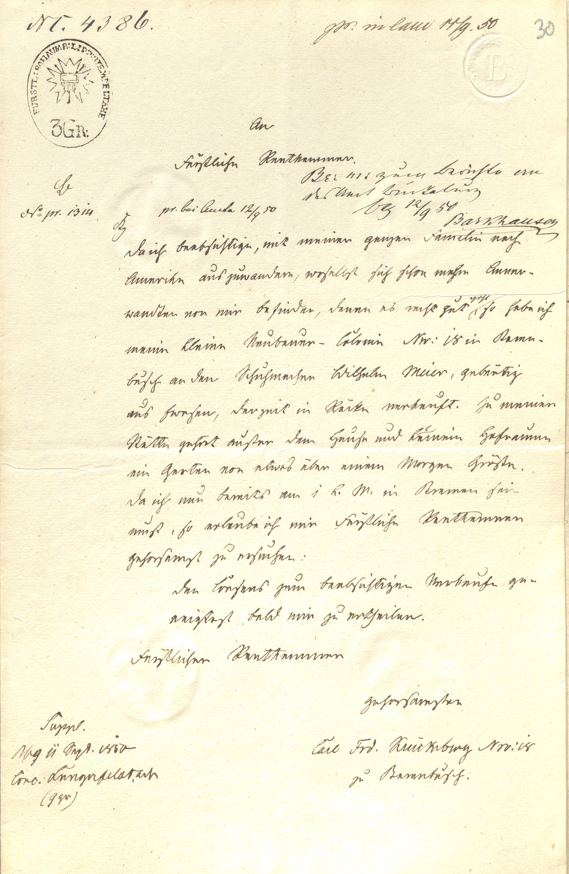 Chamber No. 4386. Presented to the Chamber on 17 September 1850. [Three-groschen stamp] Reference in the report to the Office of Bückeburg. Bückeburg, 12 September 1850. Barkhausen. B. File no. 1314, received at the Office on 12 September 1850. K. To the Princely Rent Chamber. As I intend to emigrate to America with my entire family, where several relatives of mine already reside and are doing quite well, I have sold my small new-settler holding, No. 18 in Berenbusch, to the shoemaker Wilhelm Meier, a native of Evesen, presently residing in Röcke. My holding consists, in addition to the house and a yard, of a garden of slightly more than one Morgen in size. Since I must already be in Bremen by the first of the current month, I therefore respectfully request the Princely Rent Chamber to be so gracious as to grant its consent to the intended sale as soon as possible. To the Princely Rent Chamber, most respectfully, Carl Friedrich Krückeberg, No. 18, of Berenbusch. Petition. Bückeburg, 11 September 1850. Draft noted; fee paid: 9 groschen.