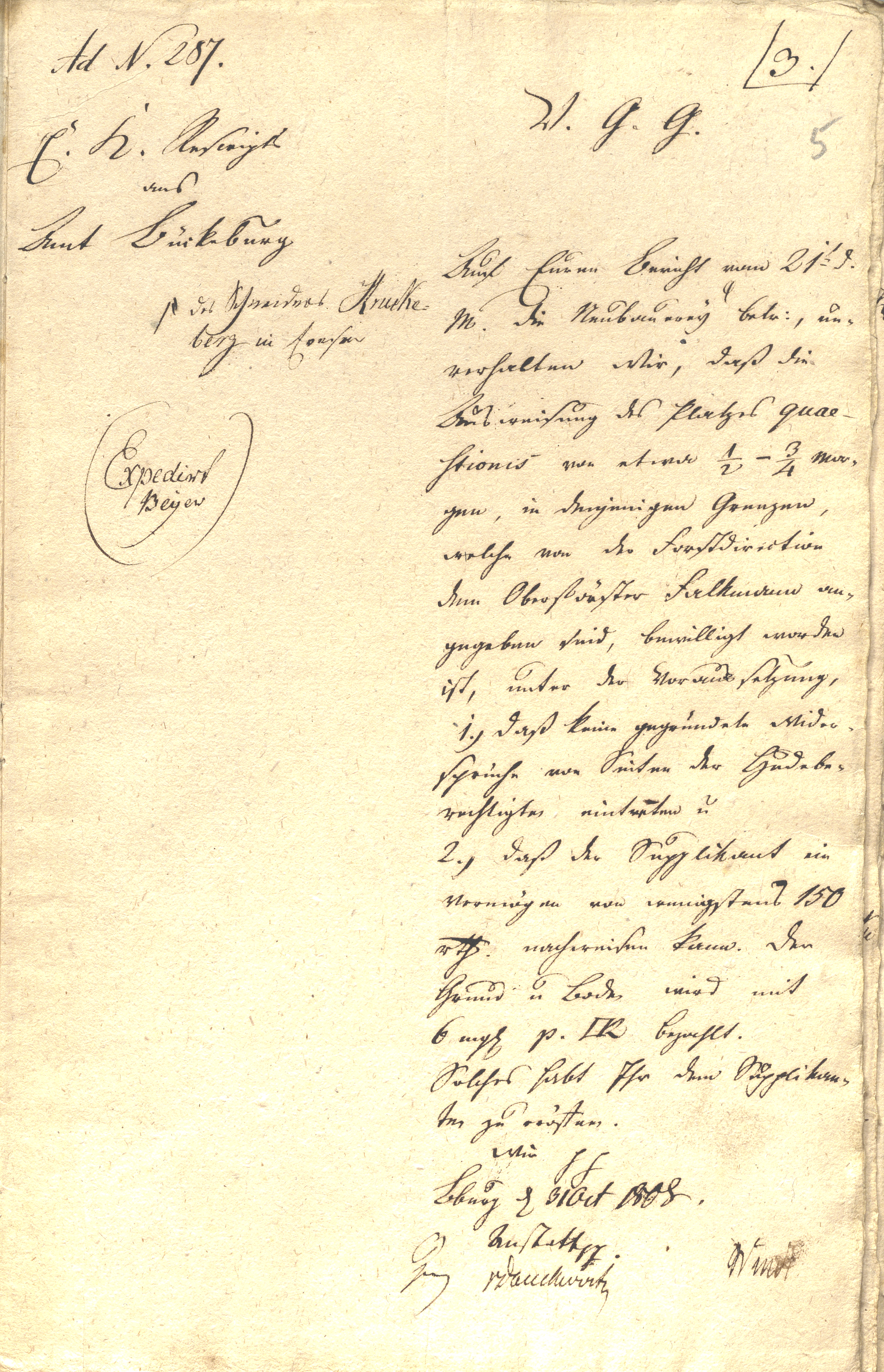 Ad N. 287. C. K. [Cammer-Kanzlei] Rescripts ans Amt Bückeburg Expedirt Beyer V. G. G.[Von Gottes Gnaden] Auf Euren Bericht vom 21ten d. M. die Neubauerung † betr:, unverhalten wir, daß die Ausweisung des Platzes quaestionis von etwa 1/2 - 3/4 Morgen, in denjenigen Grenzen, welche von der Forstdirection dem Oberförster Falkmann angegeben sind, bewilligt worden ist, unter der Voraussetzung, 1.) daß keine gegründete Widersprüche von Seiten der Hudeberechtigten eintreten und 2.) daß der Supplikant ein Vermögen von wenigstens 150 Rthl. nachweisen kann. Der Grund u. Boden wird mit 6 mg p. Quadratrute bezahlt. Solches habt Ihr dem Supplikanten zu eröffnen. † des Schneiders Krückeberg in Evesen Wie [S.S.] Bburg d. 31 Oct 1808 Anstatt[??] Wine [???] [D/W/H]anckwertz Windt