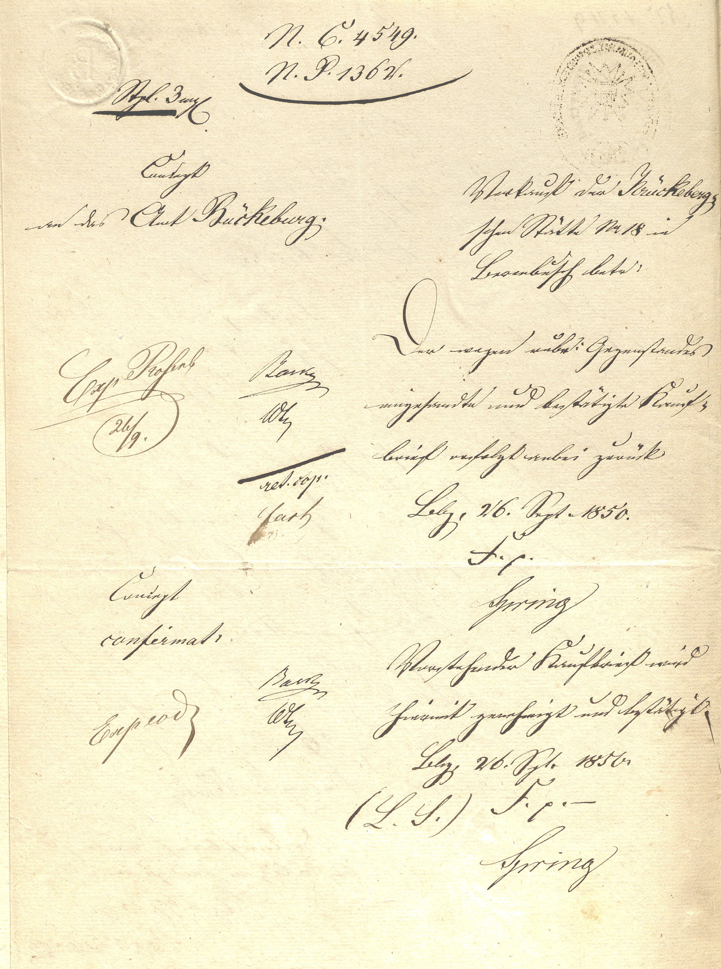 N. C. 4549. N. P. 1362. Stpl. 3 Kongl. Exp Rosenb 26/9. [Barken Why] [ret. cop.] [fart?] Bericht an das Amt Bückeburg. Verkauff der Krückebergschene Stätte No 18 in Berenbusch betr: Der wegen rubr: Gegenstandes eingesandte und bestätigte Kaufbrief erfolgt anbei zurück Bbg, 26. Sept. 1850. F. p Spring Exp eod [Barken Why] [ret. cop.] [fart?] Vorstehender Kaufbrief wird hiermit genehmigt und bestätigt. Bbg, 26. Sept: 1850 (L. L.) F. p. Spring Concept confirmat.