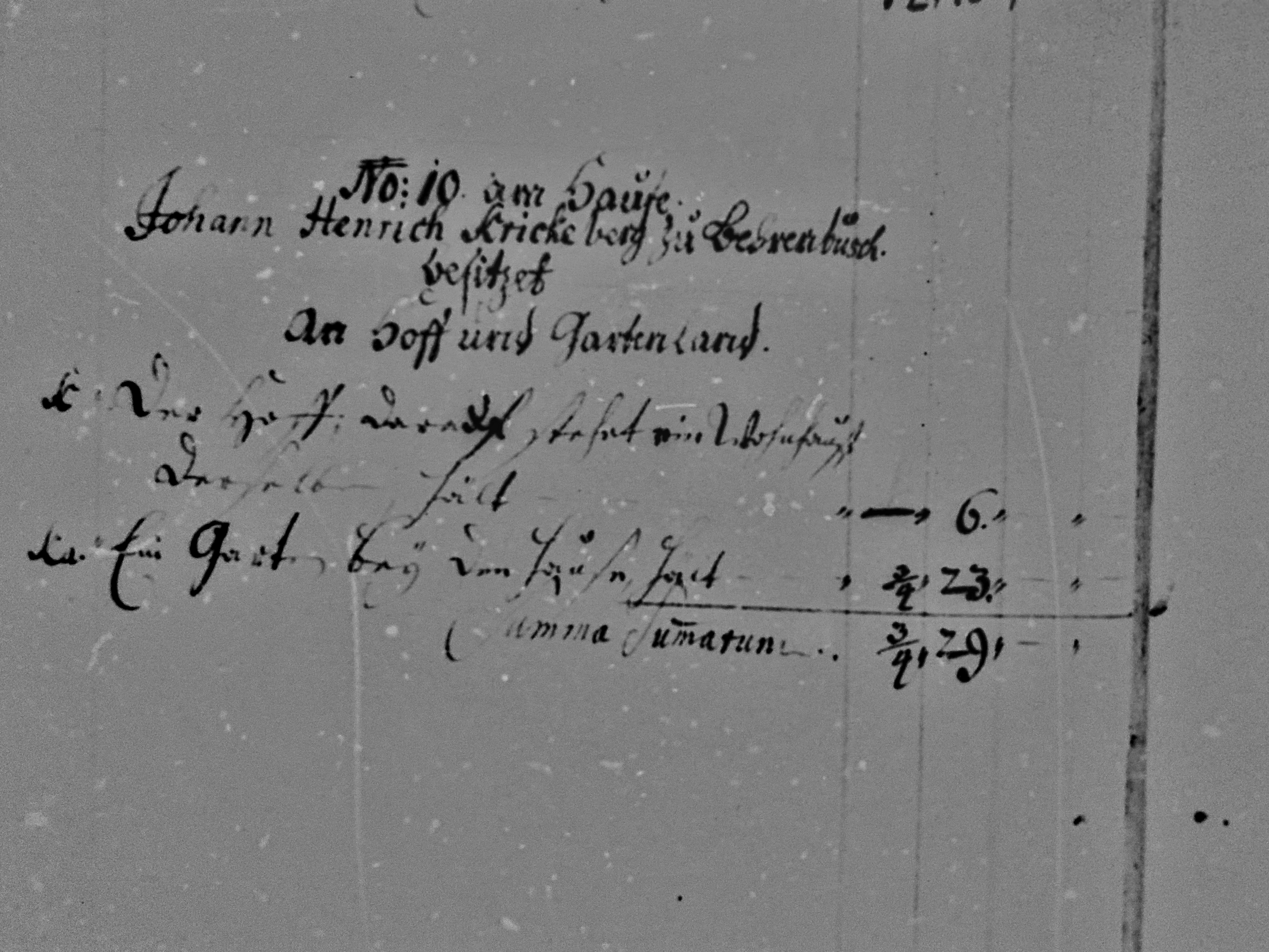 No. 10 am Hause Johann Henrich Krickeberg zu Behrenbusch besitzet An Hoff und Gartenland Der Hoff darauf stehet ein Wohnhaus Derselben hält 6 [Ruten] Ein Garten bey dem Hause hat ¾ [Morgen] 23 [Ruten] Summa Summarum ¾ [Morgen] 29 [Ruten]