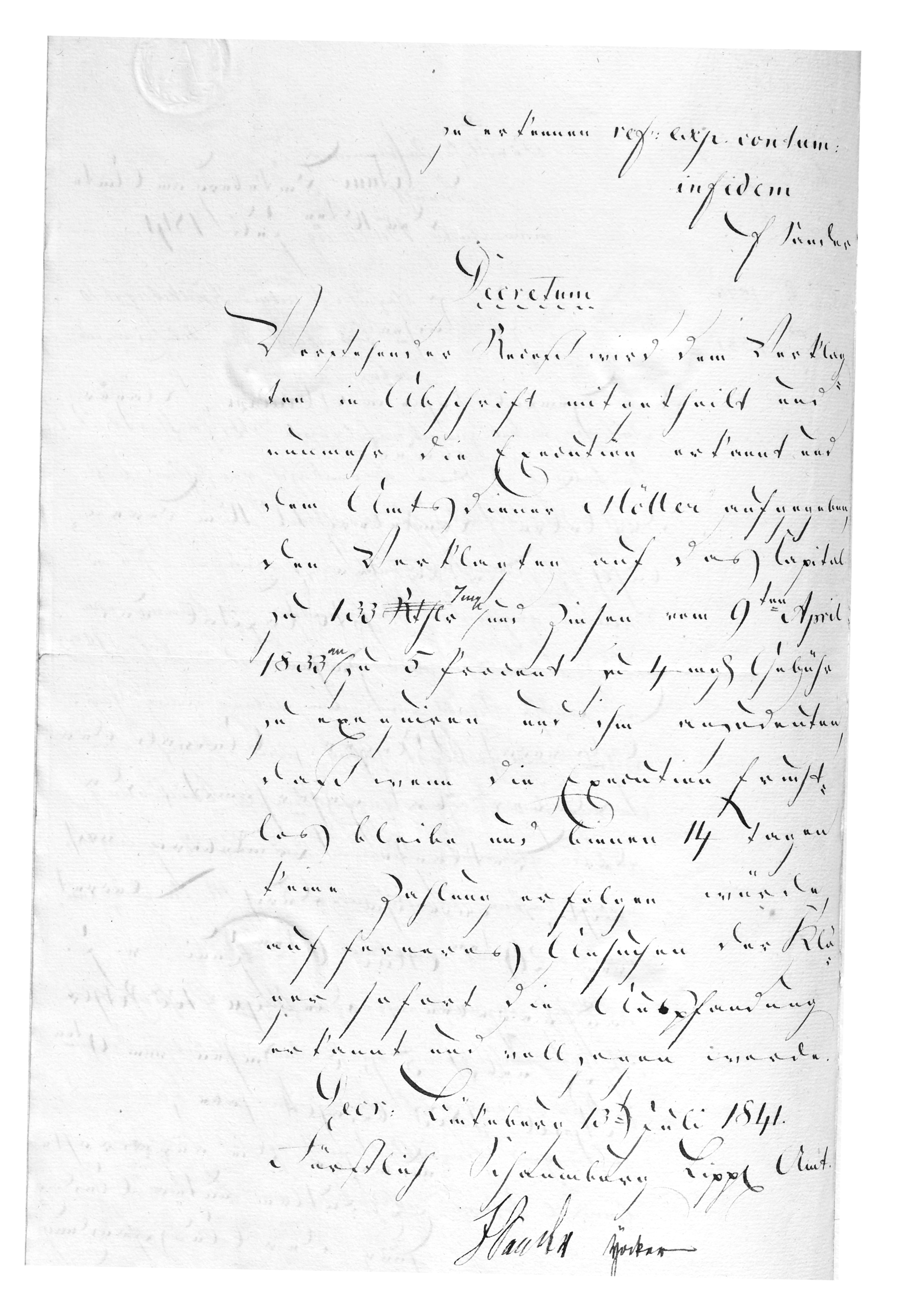 On 13 July 1841 the Amt issued its Decretum: the order was to be served on Krückeberg; execution was now recognized, and the Amtsdiener Möller (the court bailiff) was instructed to levy for the principal of 133 Reichsthaler 7 Mariengroschen, plus 5% interest from 9 April 1833 and a 4-Mariengroschen fee. Krückeberg was to be warned that if the levy proved fruitless and no payment came within 14 days, the creditor could, upon further request, have distraint immediately ordered and carried out.