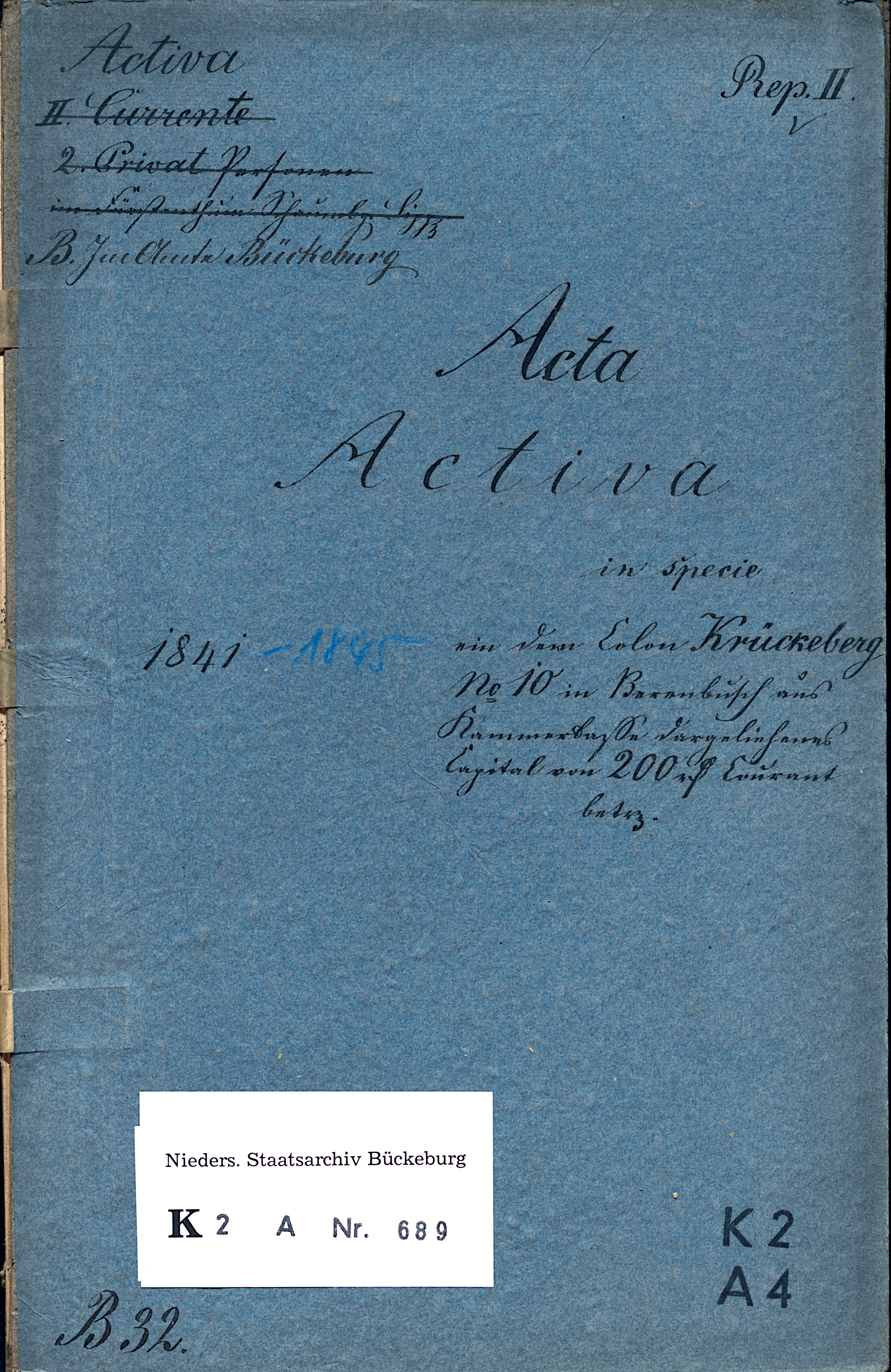Activa II. Currente 2 Privat Personen im Fürstenthum Schaumburg-Lippe B. im Amte Bückeburg Acta Activa in specie 1841-1845 ein dem Colon Krückeberg No 10 in Berenbusch aus Kammerkasse dargeliehenes Capital von 2 rthl Courant betre. B32. |