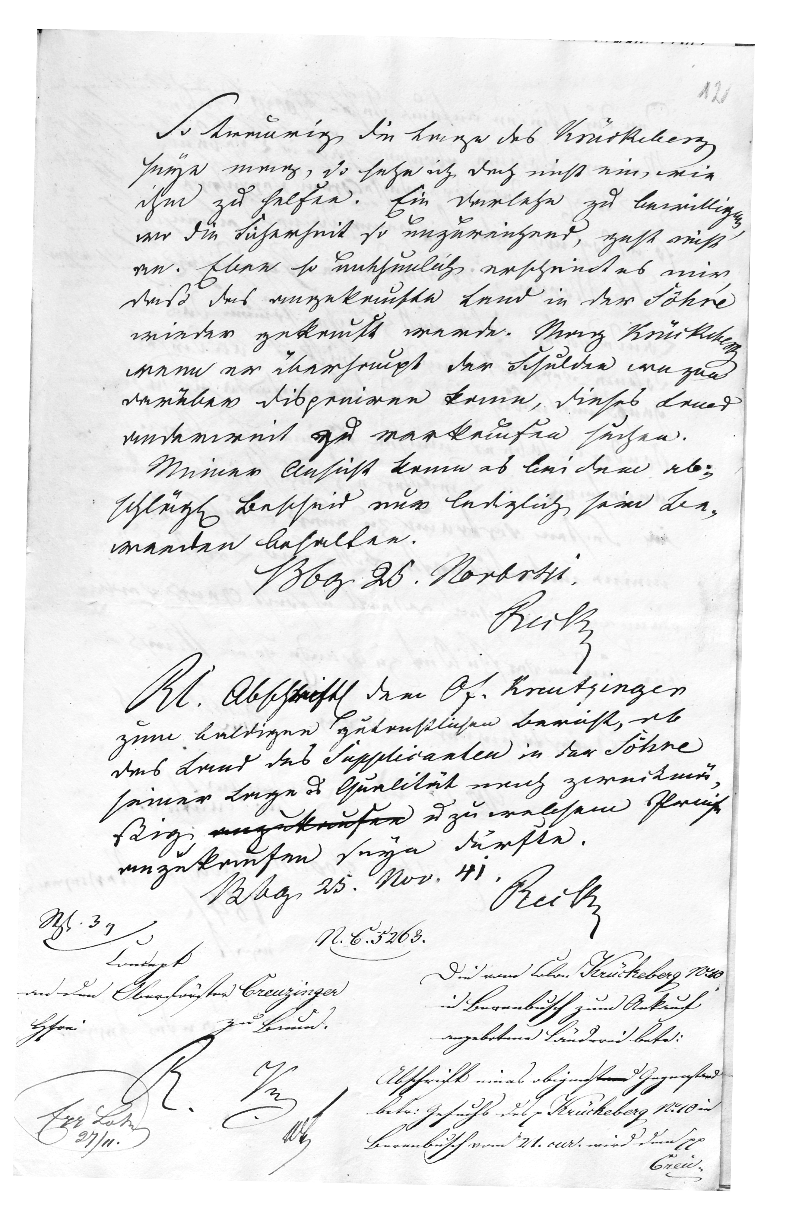 So traurig die Lage des Krückeberg seÿn mag, da sehe ich doch nicht ein, wie ihm zu helfen. Ein Darlehn zu bewilligen, wo die Sicherheit so unzureichend, geht nicht an. Eben so unerfreulich erscheint es mir, daß das angekaufte Land in der Söhre wieder gekauft werde. Mag Krückeberg, wenn er überhaupt der Schulden wegen darüber disponiren kann, dieses Land anderweit zu verkaufen suchen. Meiner Ansicht kann es bei dem abschlägl[igen] Bescheid nur lediglich sein Bewerden behalten. Bbg. 25. Novbr 41. Reck RC. Abschrift dem Of. Kreutzinger zum baldigen gutienstlichen Bericht, ob das Land des Supplicanten in der Söhre seiner Lage u. Qualität nach zweckmäßig u. zu welchem Preise anzukaufen seÿn dürfte. Bbg. 25. Nov. 41 Reck St. 3g N. C. 5263. Concept an den Oberförster Creuzinger zu Baum [These two lines appear on left side of page:] R. Vz W[??] Epp Lot[??] 27/11. [This text appears on the right side of page:] Die vom Colon Krückeberg Nr. 10 in Berenbusch zum Ankauf angebotene Länderei betr: Abschrift eines obigen Gegenstand betr: Gesuchs des p Krückeberg No 10 in Berenbusch vom 21. cur. wird dem pp. Creuzinger mit dem Auftrage anbei zugestellt, baldigst gutächtlich zu berichten, ob das Land des Supplikanten in der Söhre seiner Lage und Qualität nach zweckmäßig und zu welchem Preise angekaufen sein dürfte. Bburg 25. Novbr 1841. F.p.[Für protokoll] [clerical initials:] Lm L [bottom right] An den Durchlauchtigsten Gnädigsten Regierenden Fürst und Landes Herren |