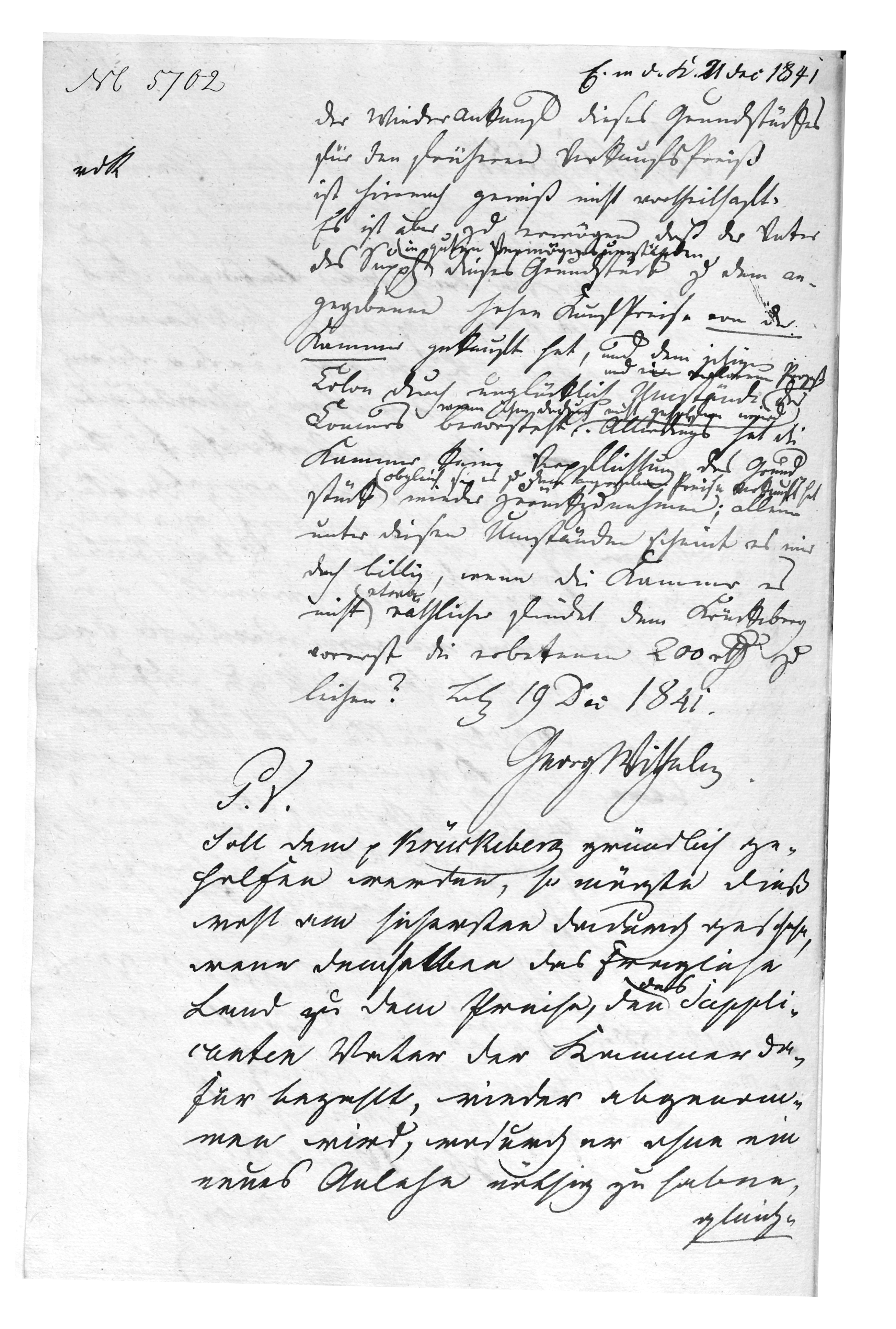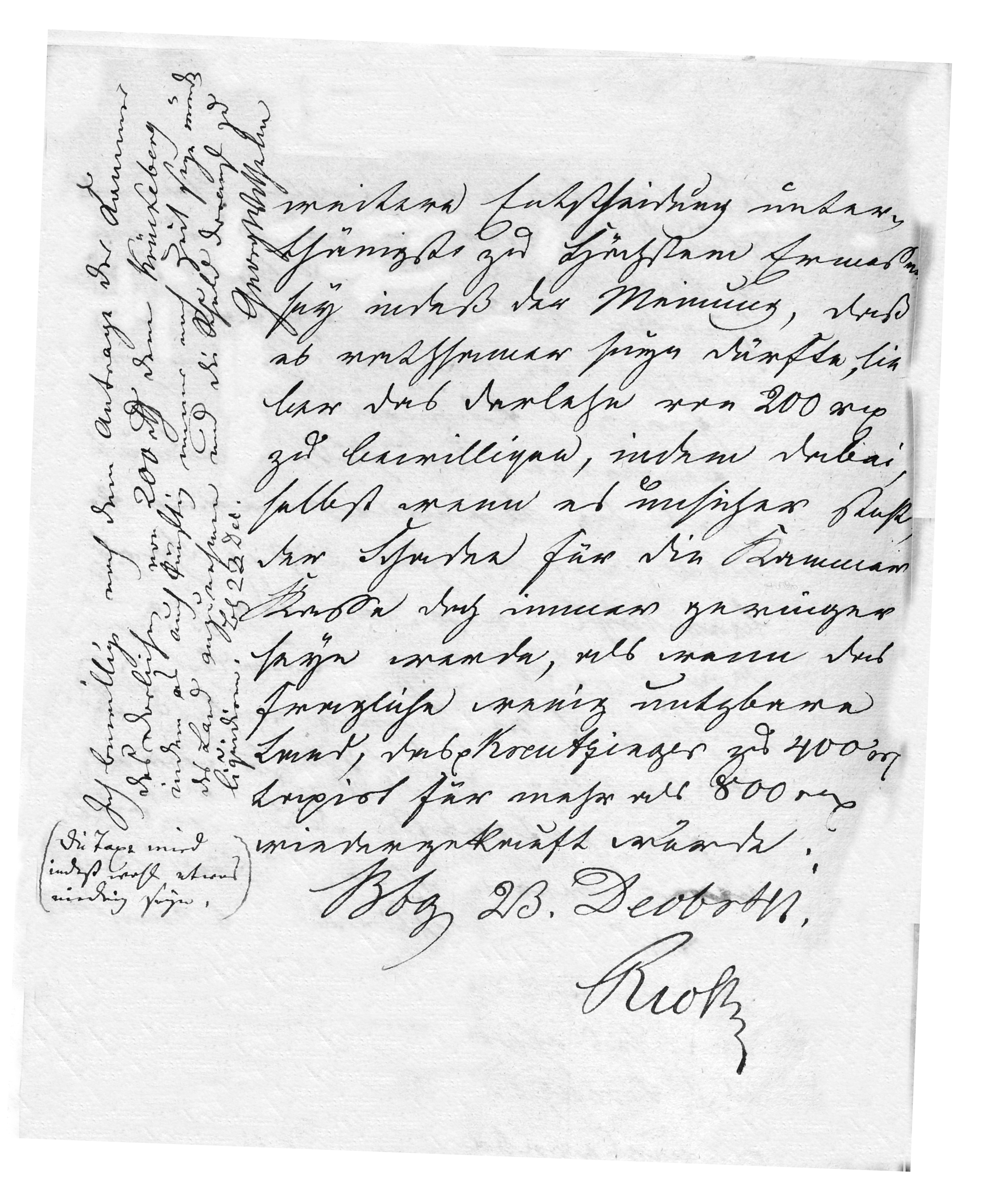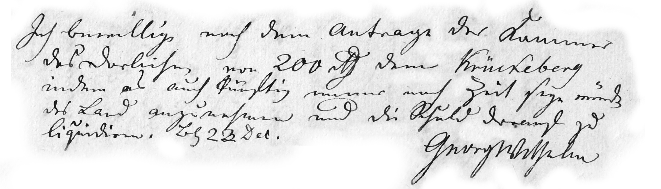I approve, in accordance with the chamber’s petition, the loan of 200 rt to Krückeberg, since there will still be time in future to accept the land and settle the debt upon it. Bückeburg, 23 Dec. Georg Wilhelm |