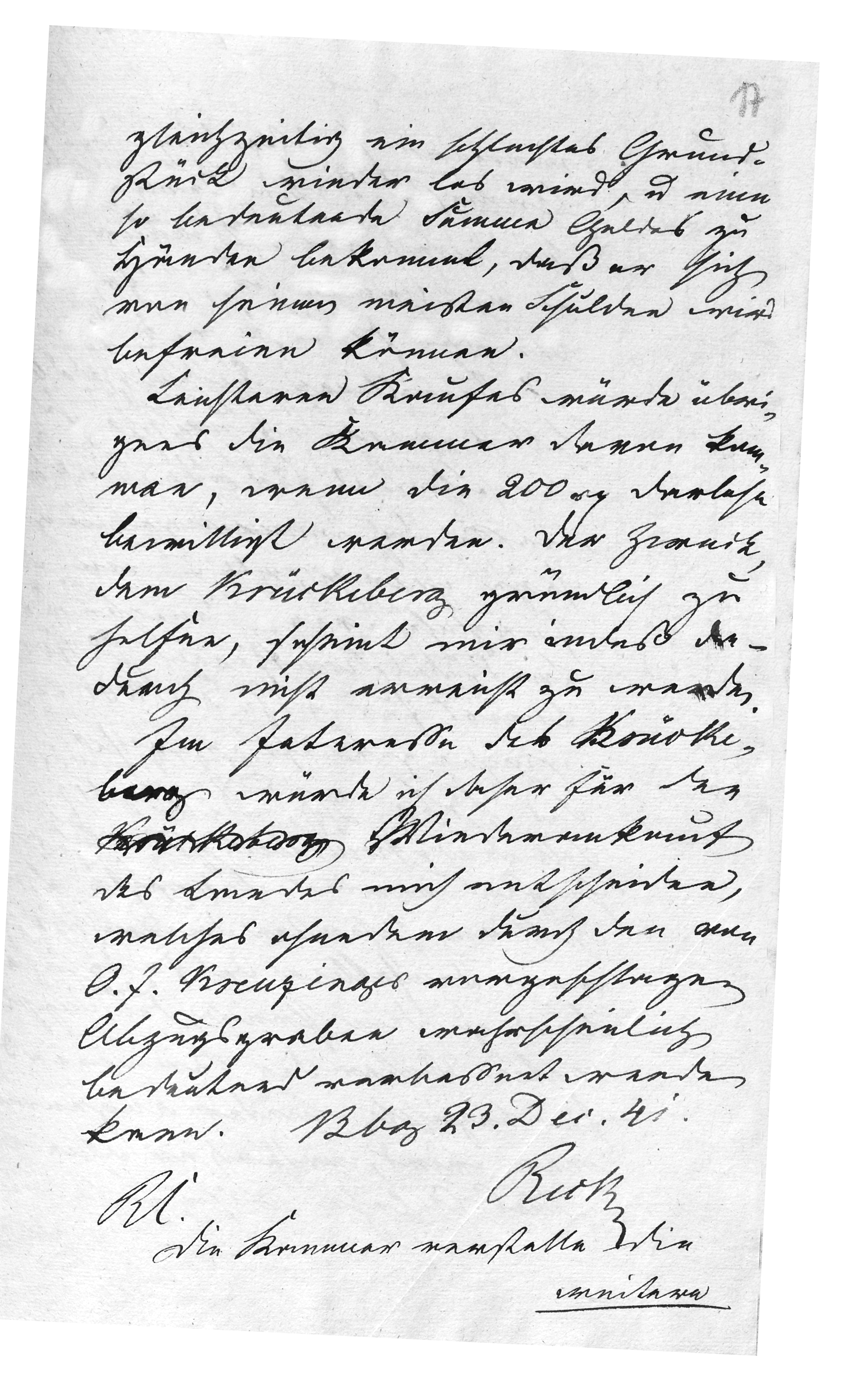 per Vorstehung (by the authority of) If thorough assistance is to be given to Mr. Krückeberg, this would most likely be best achieved by taking back the disputed land at the price paid by the petitioner’s father to the chamber, whereby he would, without needing to take out a new loan, simultaneously rid himself of a poor property and receive such a significant sum of money that he would be able to free himself from most of his debts. The chamber could more easily take action if the 200 rt loan were granted. However, the goal of thoroughly assisting Mr. Krückeberg, it seems to me, is not being achieved in this way. In the interest of Mr. Krückeberg, I therefore decided to support the repurchase of the land by him, which can be significantly improved by the drainage trench suggested by O. f. Kreuzinger. Bückeburg, 23 Dec. 41 RC[Rentcammer] Reck I most humbly leave any further decision to Your Highest discretion; however, I am of the opinion that it would be more advisable to approve the loan of 200 rt, since even if the security is uncertain, the loss to the chamber treasury would still be smaller than if the parcel of land in question—of little use and appraised by Kreutzinger at 400 rt—were bought back for more than 800 rt. Bbg., 23 Dec. 1841. Reck |